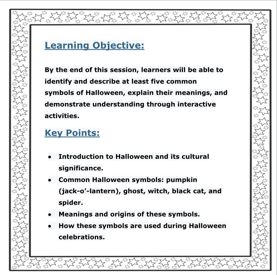 This engaging Halloween-themed lesson plan helps children explore the meaning and origins of popular Halloween symbols such as the pumpkin (jack-o’-lantern), black cat, witch, and ghost. Through fun activities, coloring pages, and guided discussions, students learn the history and cultural significance of each symbol while practicing vocabulary and comprehension skills. The included templates make it easy for teachers to organize lessons, encourage creativity, and foster curiosity about traditions in a fun, age-appropriate way that combines learning with festive art activities.