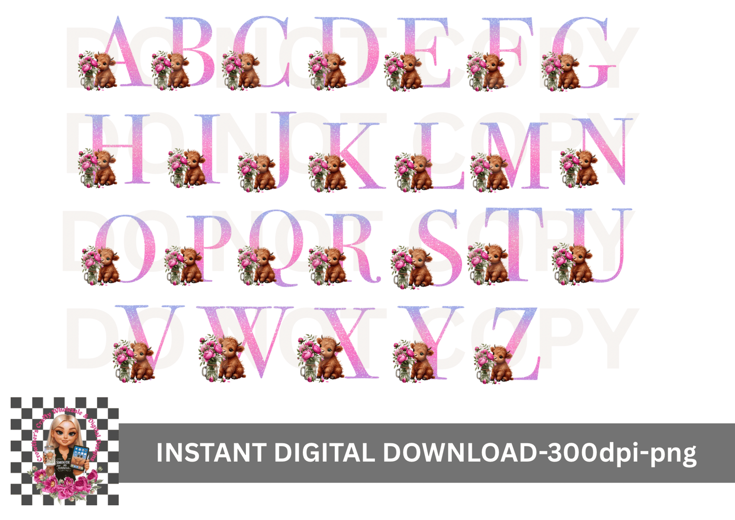 🎨 set of 26 Rainbow highland cow Alphabet 300dpi high quality designs.