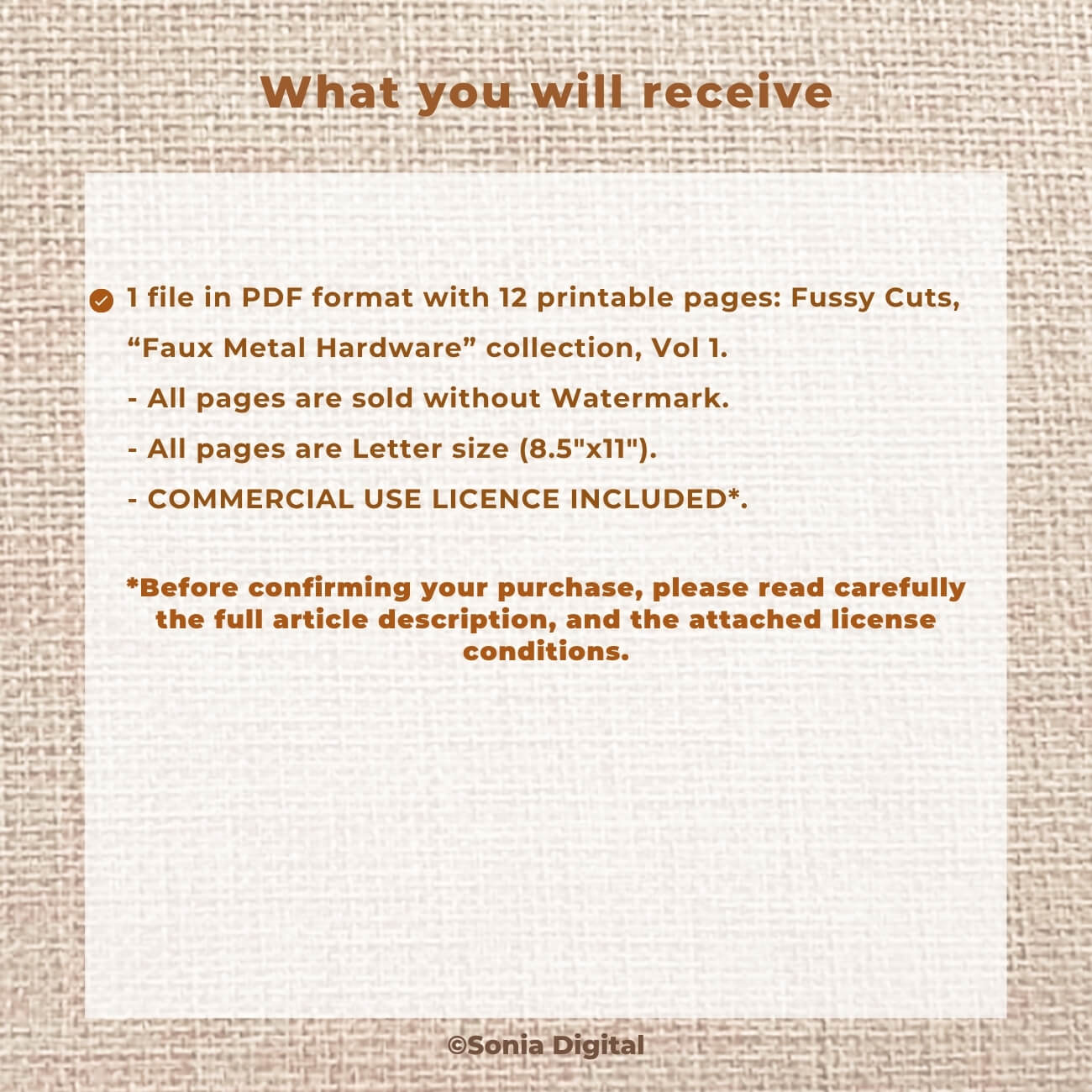 🔸12 printable Fussy Cuts pages, “Faux Metal Hardware” Collection (Vol 1). In Letter size, 8.5”x11”. All pages are sold watermark-free. Fussy Cuts Sizes vary. Commercial use license included*.