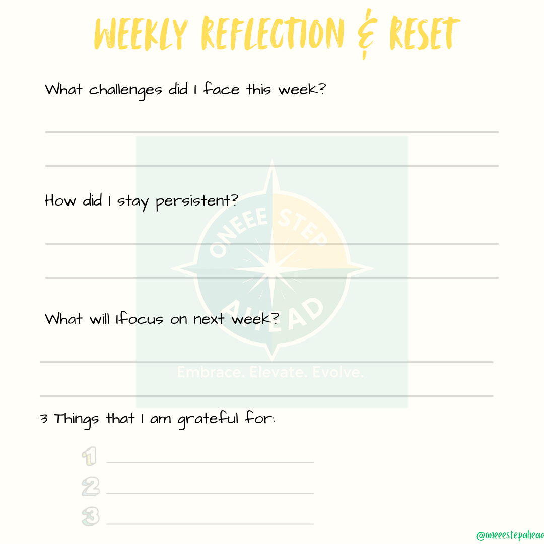Weekly Reflection & Reset: Reflect on challenges, progress, and set next week’s goals.