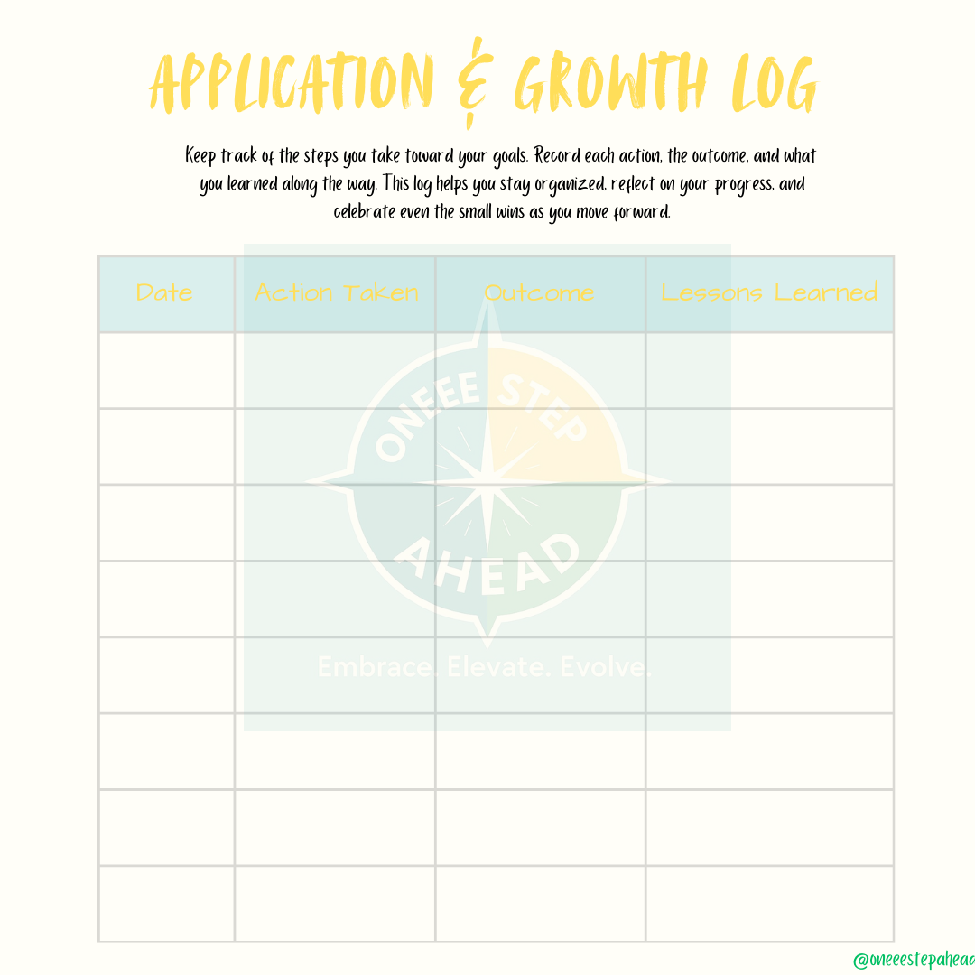 Application & Growth Log: Track steps, actions, outcomes, and lessons learned.
