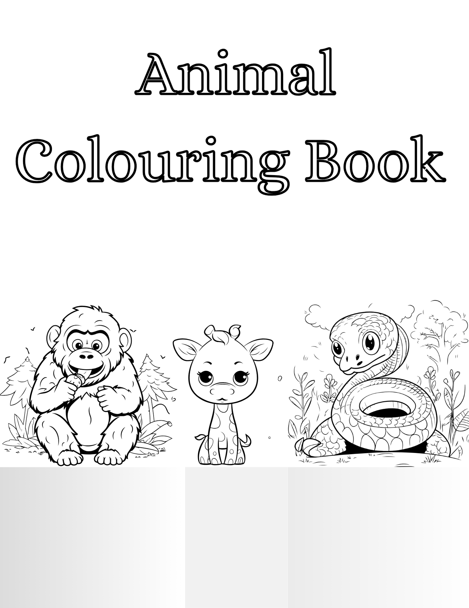 Animal Colouring Book is a delightful and engaging colouring adventure designed for kids who love cute and friendly animals. Inside, you’ll find a collection of charming animal illustrations—featuring playful creatures like a happy gorilla, adorable snakes, and more—drawn with bold, clean lines that are easy to colour.