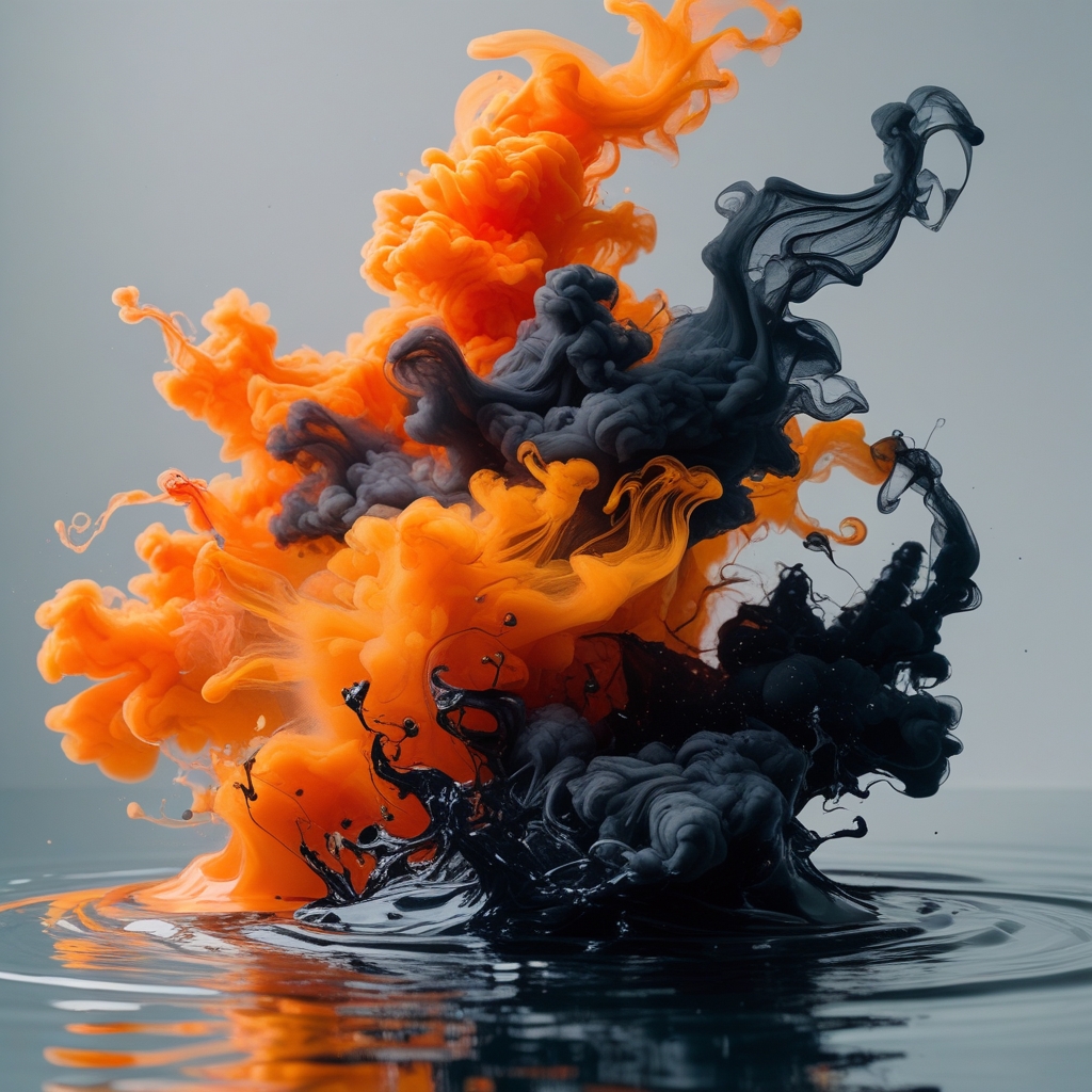 Abstract macro photo of vibrant orange and black ink swirling and billowing in water against a light background, creating beautiful, ethereal clouds and tendrils, fluid dynamics, high resolution, studio shot, cinematic.