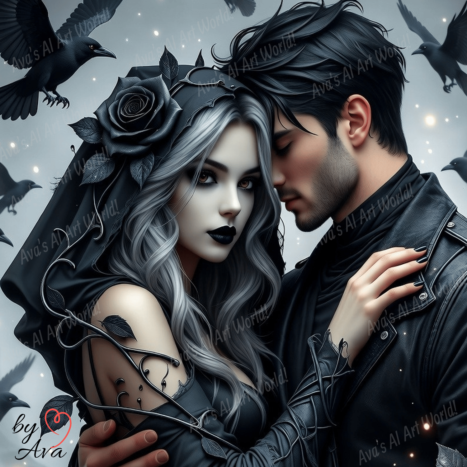 Two souls, bound by darkness and light, form the emotional core of this artwork. The black rose, the ravens, and the soft glowing particles create a mysterious atmosphere filled with passion and gentle melancholy.
