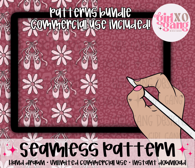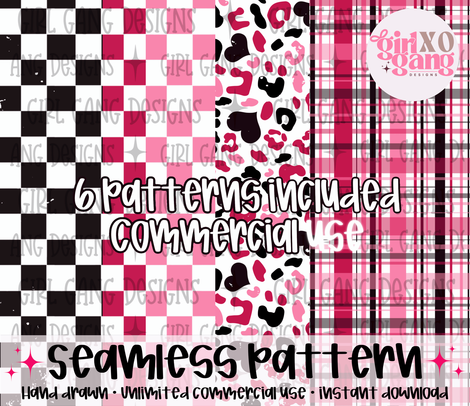 6 valentine seamless patterns PNG, red pink black checker, heart leopard, plaid pattern papers commercial use okay