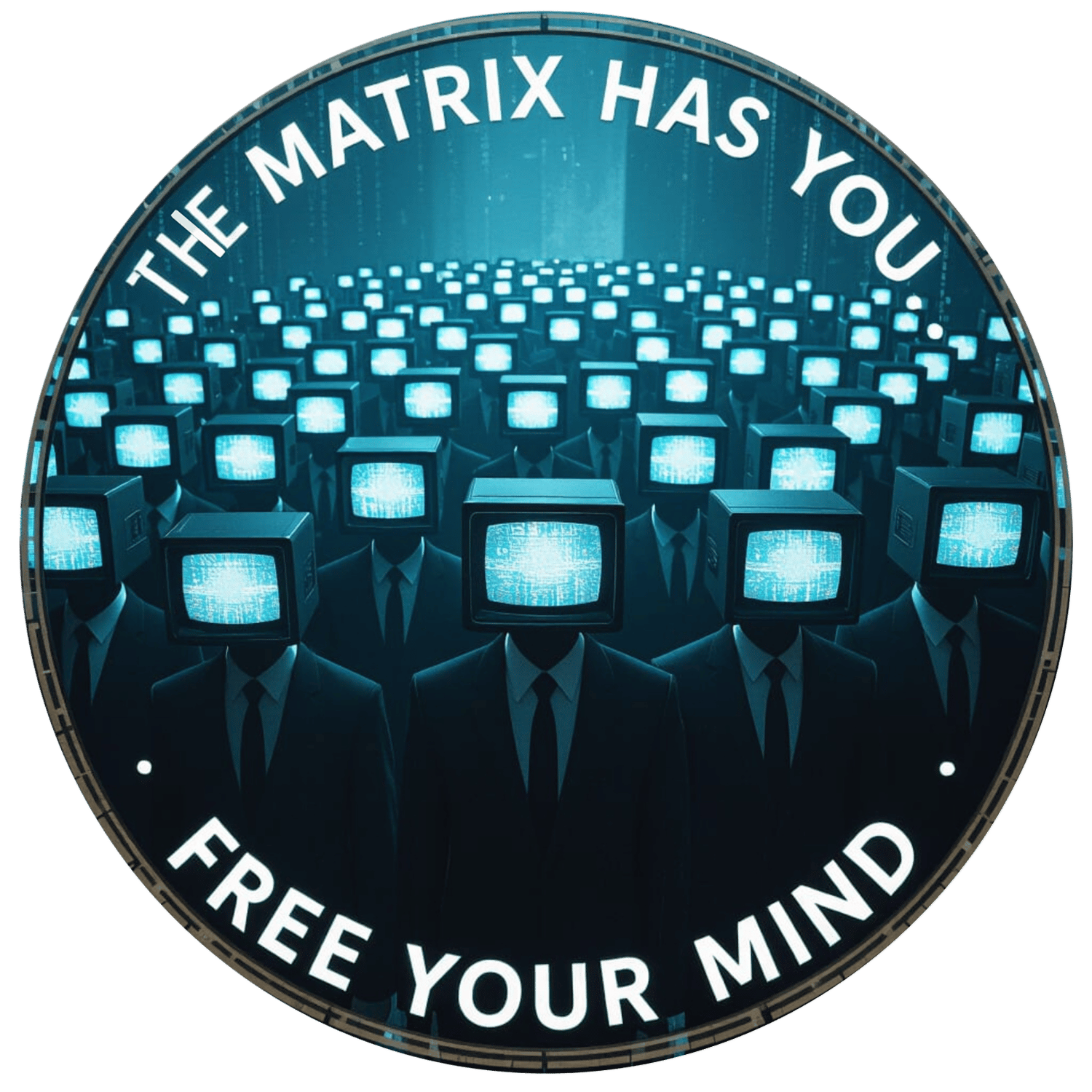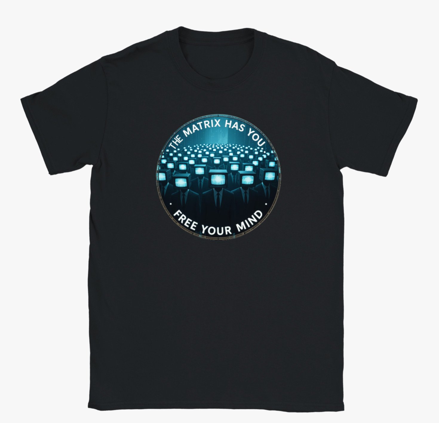 Designed for thinkers, dreamers, and anyone determined to rise above the programming of modern life, this graphic tee features a striking circular illustration of suited figures with glowing TV screens for heads — a powerful symbol of conformity in a world saturated with information.