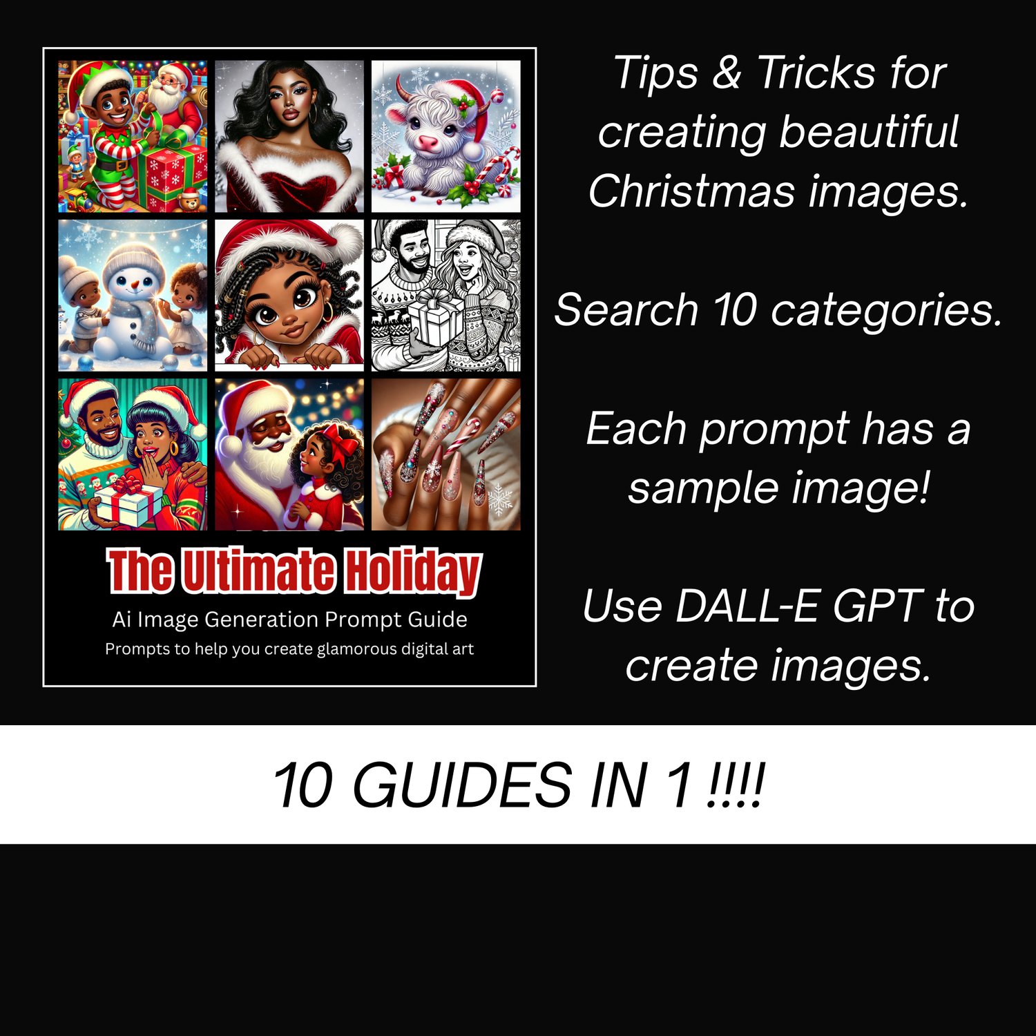 Bring the magic of the holidays to life with this 100-prompt guide, designed to help you create stunning Christmas-themed images using DALL·E GPT in ChatGPT Pro. Each prompt comes with a sample image and is organized into 10 festive categories for easy use.