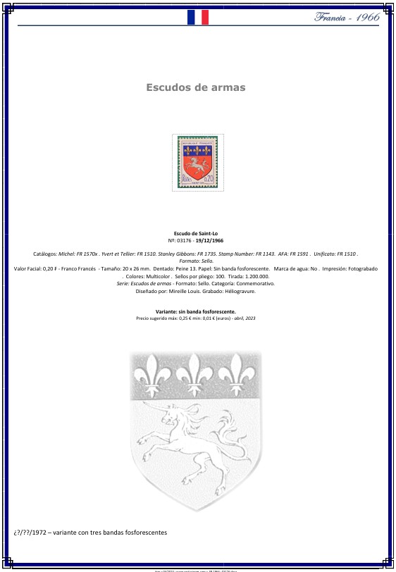 Ficha filatélica FR‑1966‑03176 – Francia 1966: Escudo de Saint‑Lô (PDF imprimible A4)