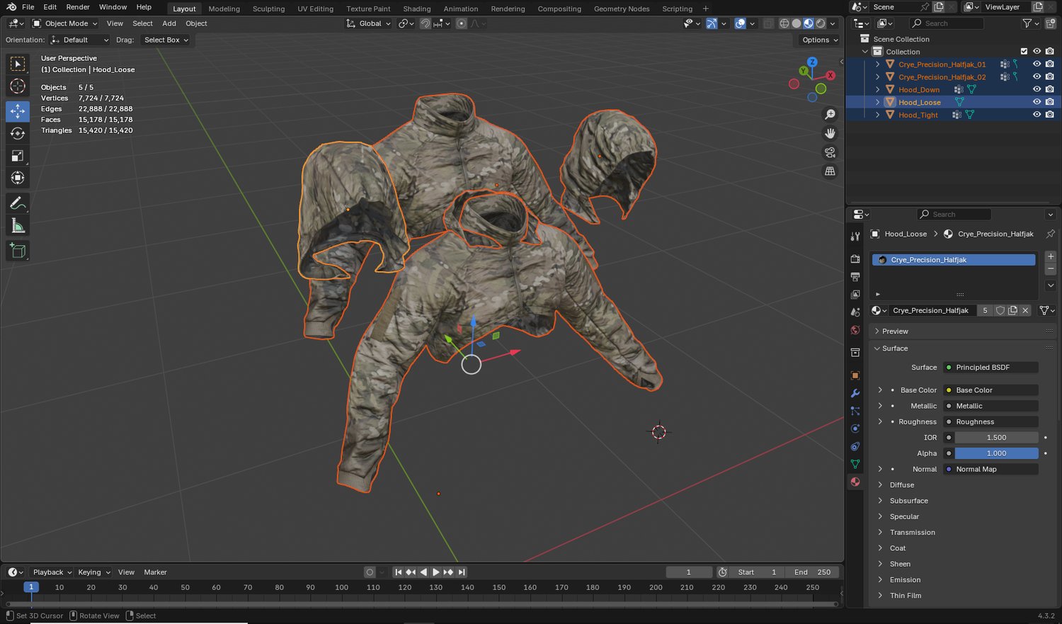 Game-ready 3D model of the Crye Precision Halfjak. Includes Multicam, Olive Drab and Black variants for easier retexturing. The sleeve can be fitted over the hand or over the wrist. These setups are included. Hood loose, hood tight and hood down versions aswell. Great for games such as Arma 3, DayZ, Reforger, Ready or Not, etc.
