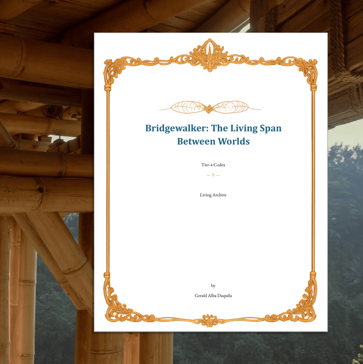 The T4 Codex outlines the concept of the Bridgewalker, a living archetype embodying the balance between conflicting worlds. It explores the roles, practices, and legacy of the Bridgewalker, emphasizing the importance of resonance, consent, and navigating thresholds. Ultimately, it advocates for a harmonious existence across divergent realms through Sacred Exchange and stewardship.