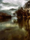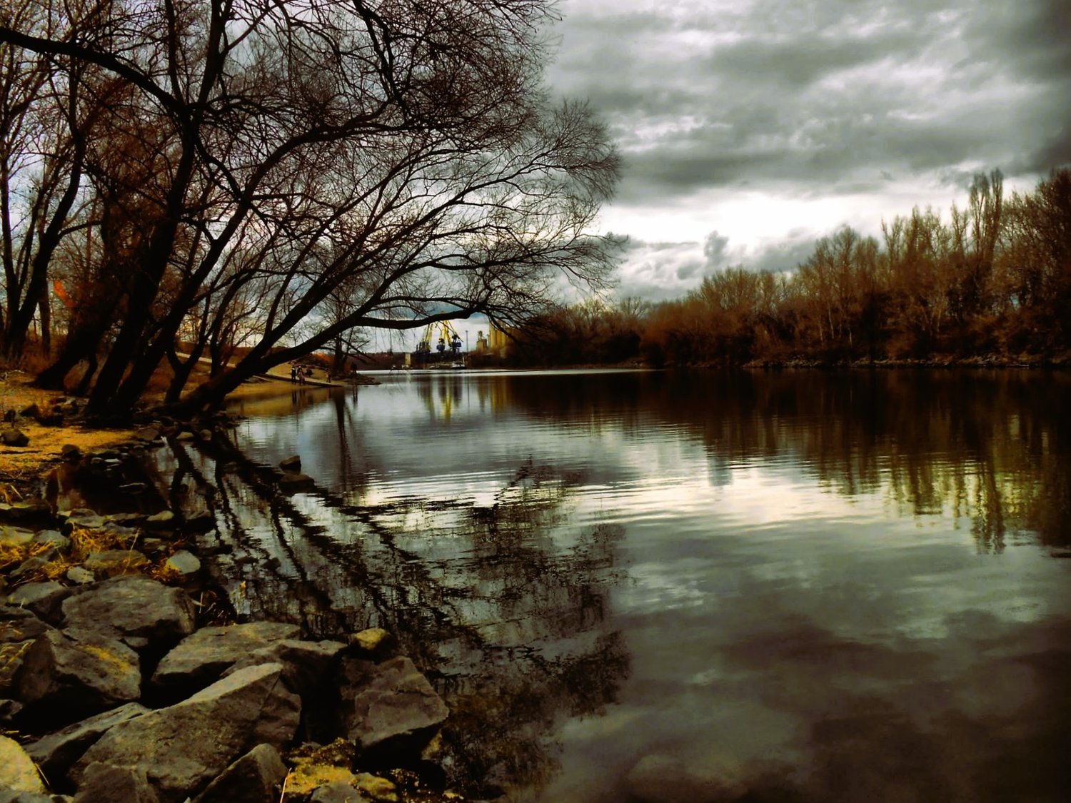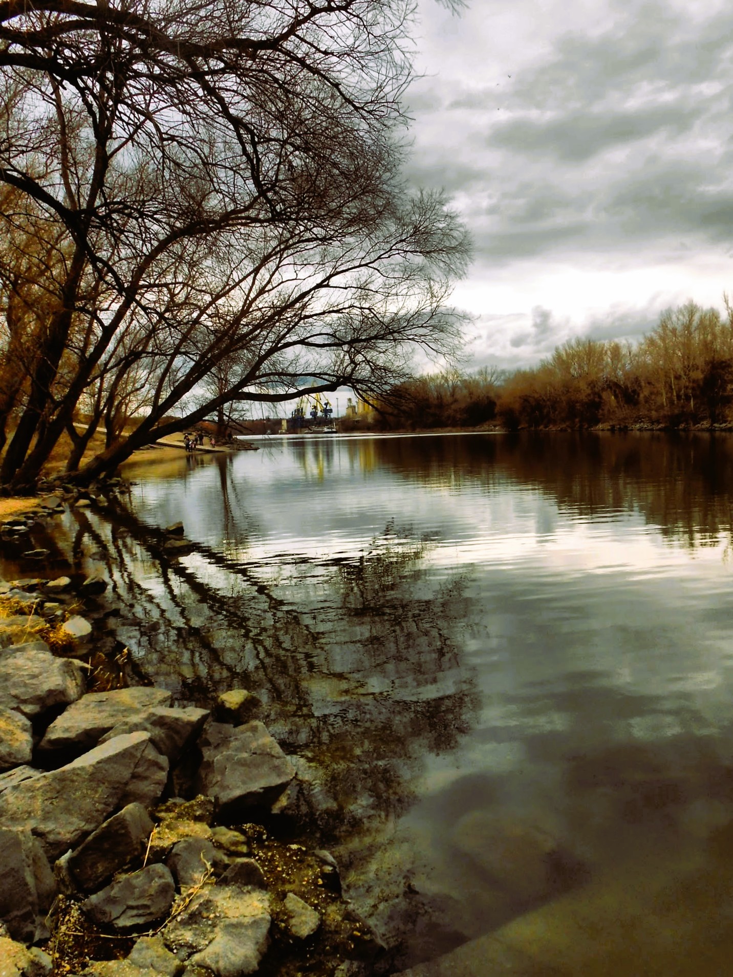 A moody riverside scene under a dramatic cloudy sky, with leafless trees reflecting on the calm water. The subdued tones of brown and gray enhance the tranquil, slightly melancholic atmosphere. In the distance, industrial structures add contrast to the natural setting.