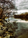 river, landscape, overcast, water, tree, reflection, cloudy, winter, nature, bare, shoreline, tranquil, calm, dramatic, industrial, scenery, outdoor, moody, branch, environment, sky, horizon, ripple, peaceful, cold, cloudy_sky, dusk, rural, stillness, banks, wilderness, seasonal, silence, contrast, solitude, symmetry