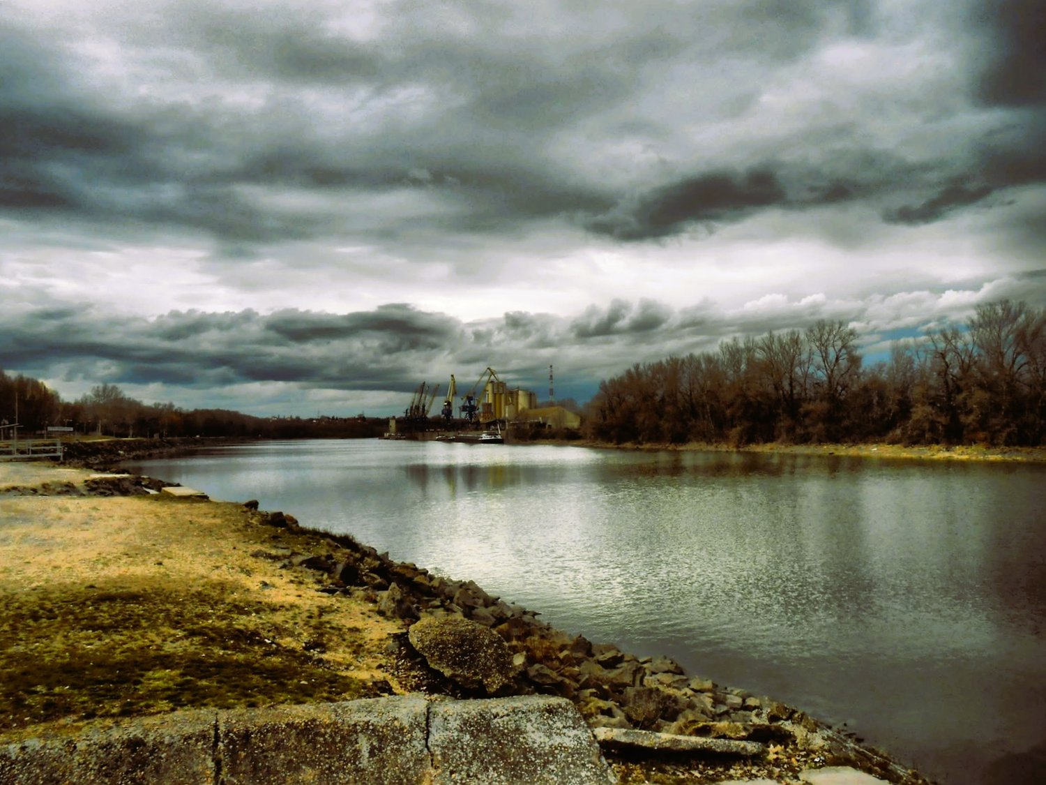 Overcast riverbank landscape with bare trees and industrial backdrop