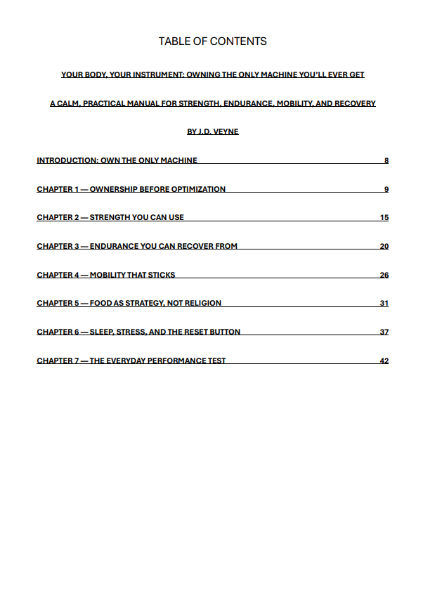 You don’t need a new device. You need ownership. Your Body, Your Instrument is a quiet, practical manual for running the only machine you’ll ever get—strength you can use, endurance you can recover from, mobility that sticks, food as strategy, sleep that sets the ceiling, and tiny tracking that steers decisions.