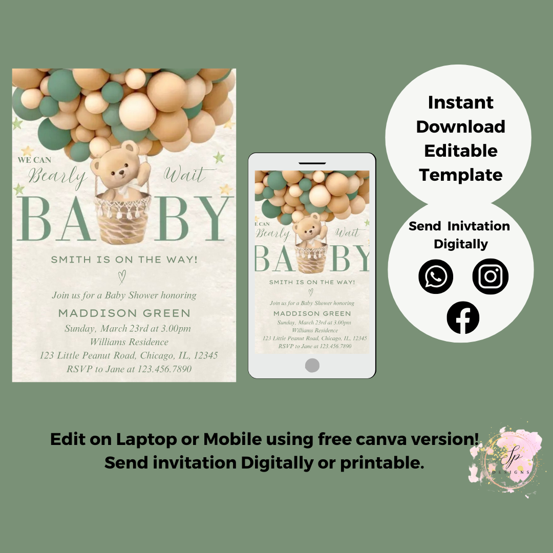 Editable Bear Baby Shower Invitation, We Can Bearly Wait Baby Shower Invite, Baby Shower Invitation Template