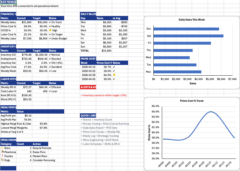 This 9-sheet suite covers every financial and operational metric a bar manager needs, pour cost, recipe costing, inventory, waste tracking, labor scheduling with SPLH, and a full beverage menu engineering matrix. Works for restaurant bars, hotel bars, standalone bars, and casino lounge operations.