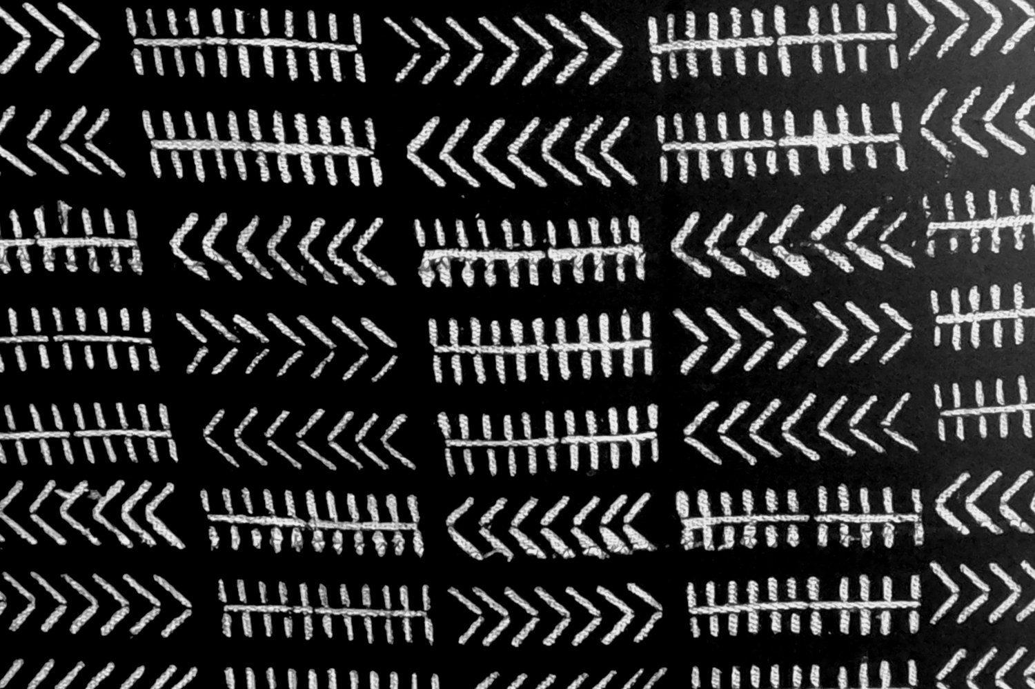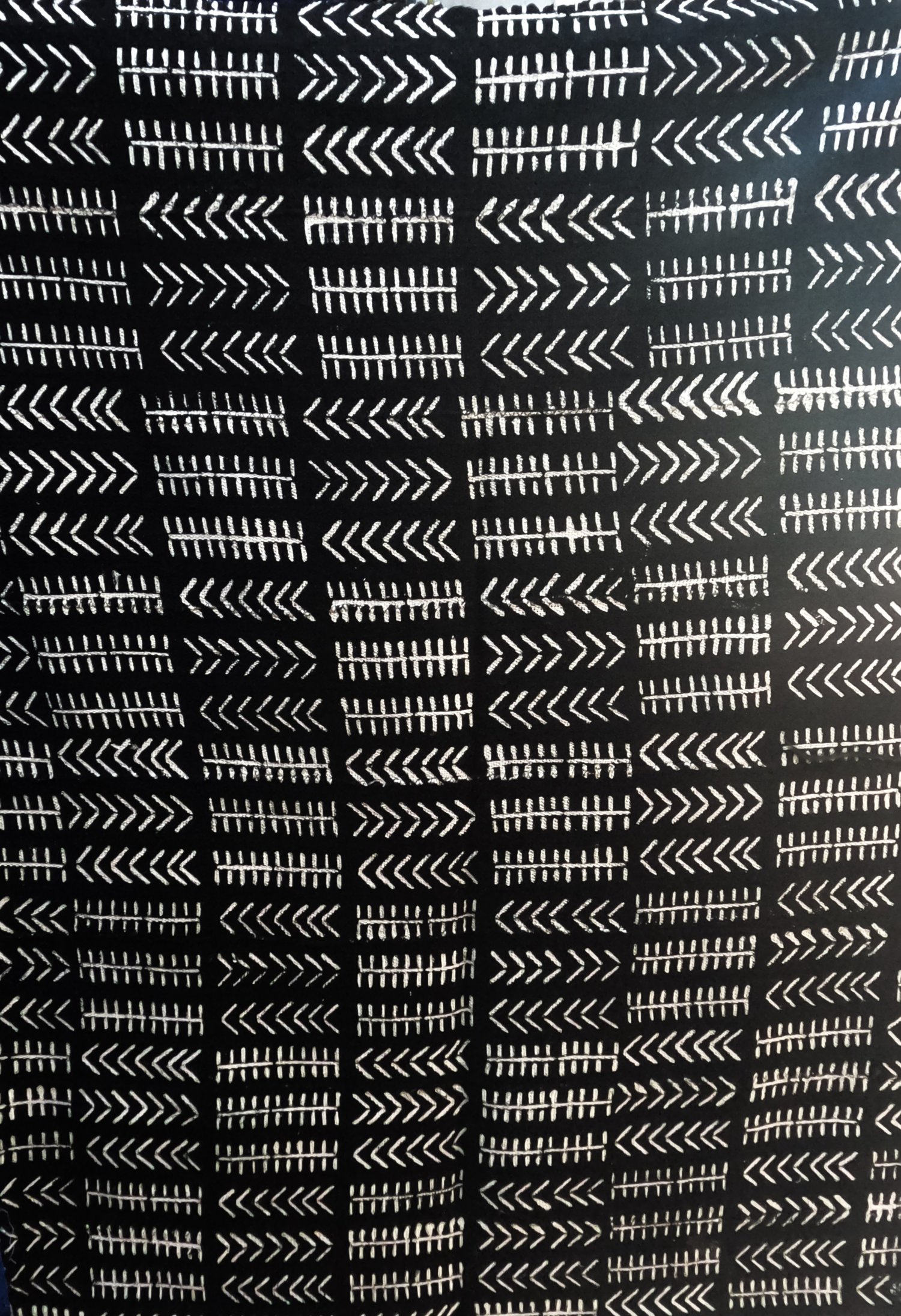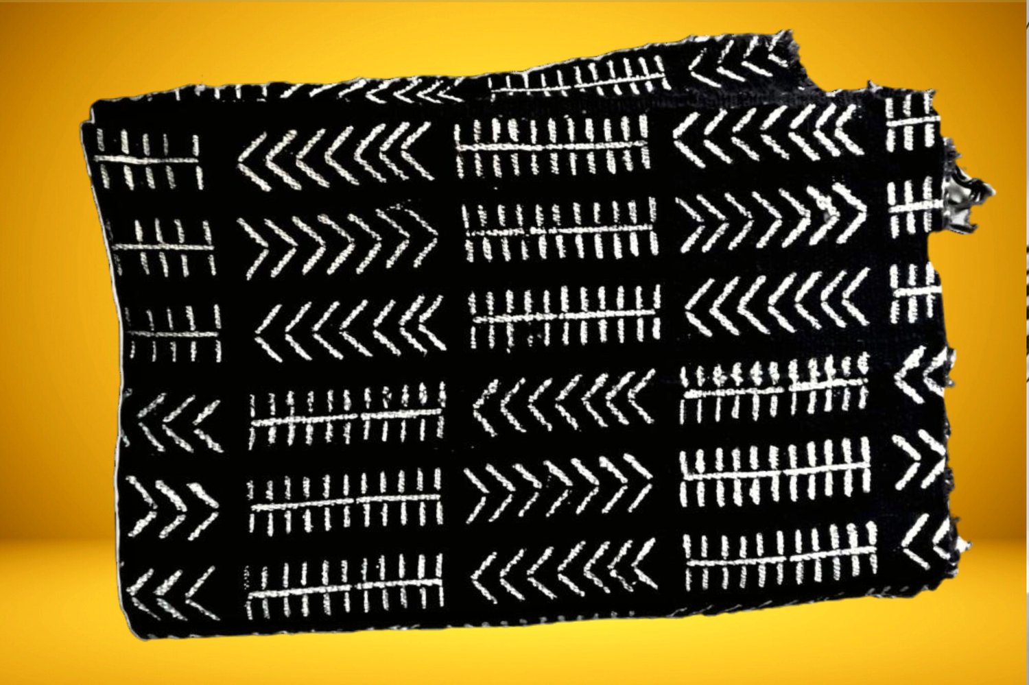 The Golden Tribal Mud Cloth has a design with traditional black and white ornaments. The parallel lines and the clusters symbolize unity and community, and reflect the importance of togetherness in many African cultures. The arrow shapes represent change, movement or transformation.