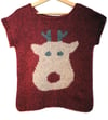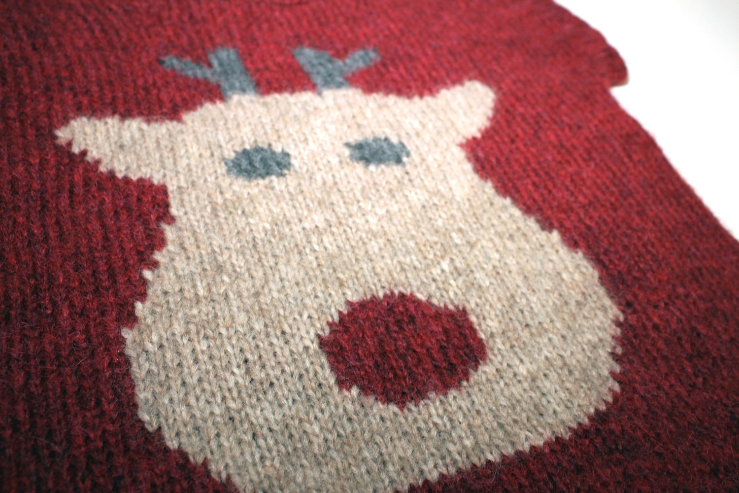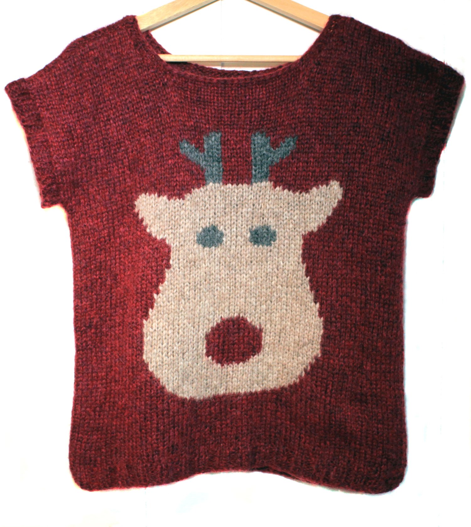 This pattern includes instructions for both adult and child sizes, the reindeer is knit using the intarsia method from full colour charts. This sweater is designed to be worn with 2 - 3” / 5 - 7.5cm of positive ease.