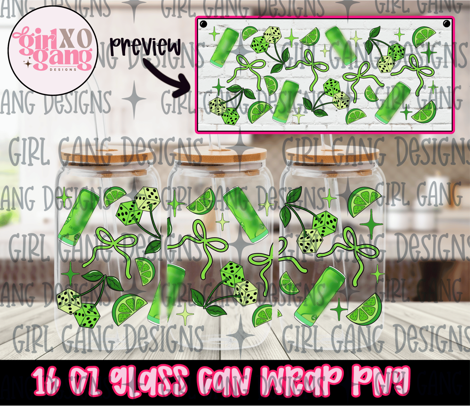 Alan energy lime 16 oz glass can wrap png, cute energy drink coquette cherry dice lime png, trendy drink 16 oz can wrap png