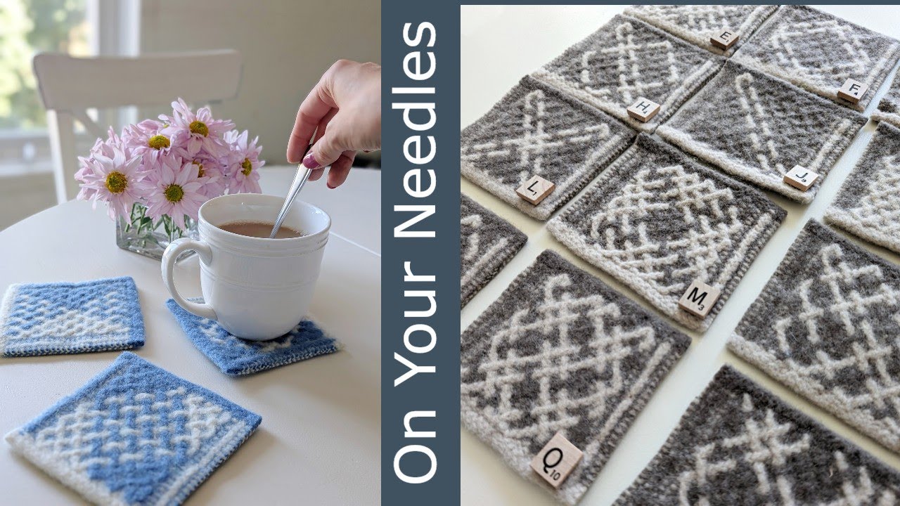 The Coasting patterns capture the joy of Woven Knitting. Learn this innovative technique where different designs magically emerge as you repeat the same pattern! Knit all four coasters simultaneously in the round. When they’re off your needles, felt them & cut them into individual coasters!