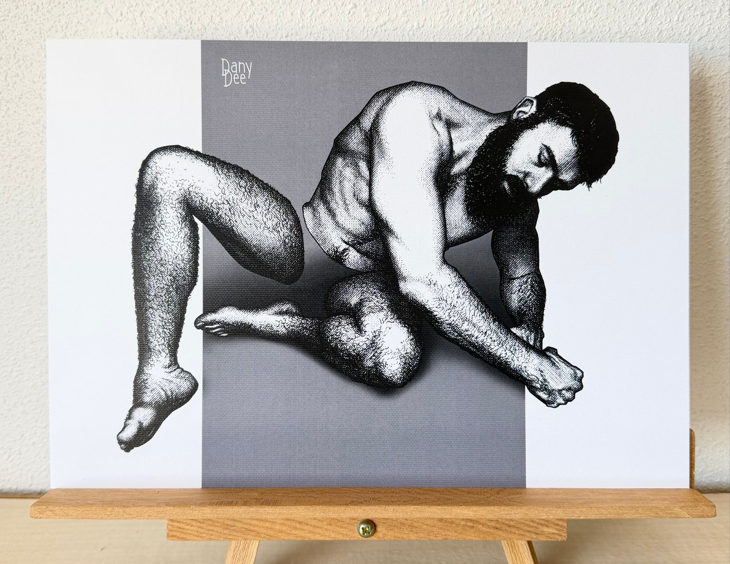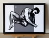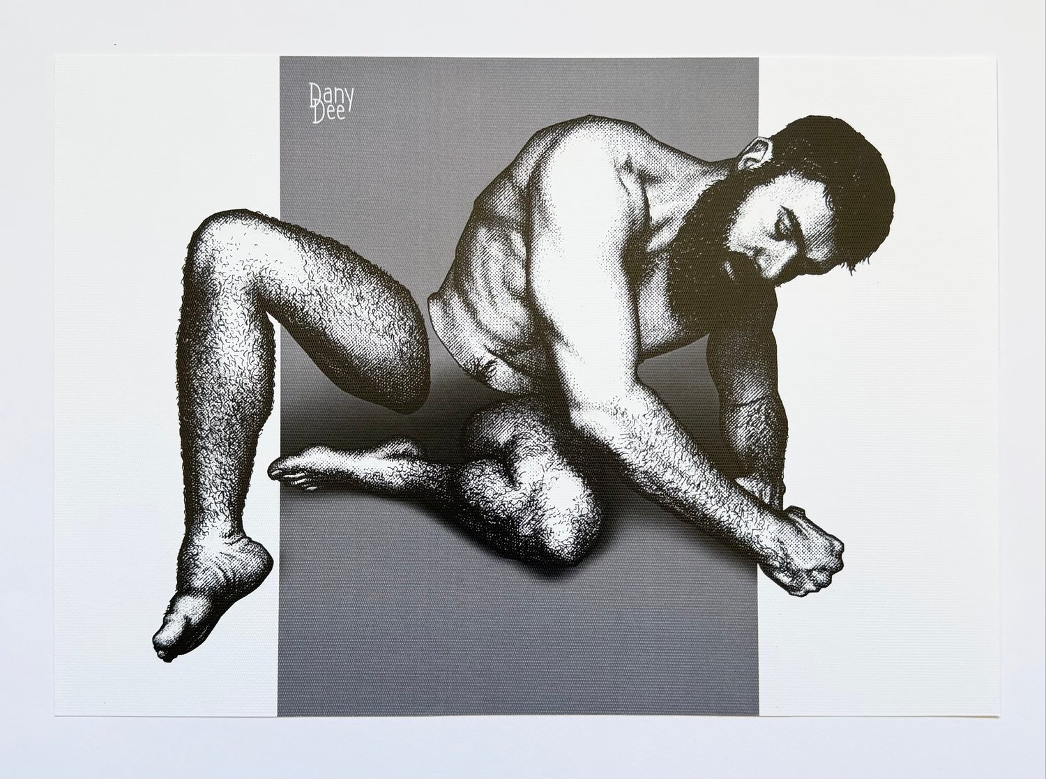 “Hollow No. 29” is a hand-drawn, monochromatic A4 art print from the Hollow series — a conceptual queer art piece exploring censorship through the male nude, where a big, hairy, bearded man curls tightly into himself, the hollow cutting through the centre of a body turned completely inward.