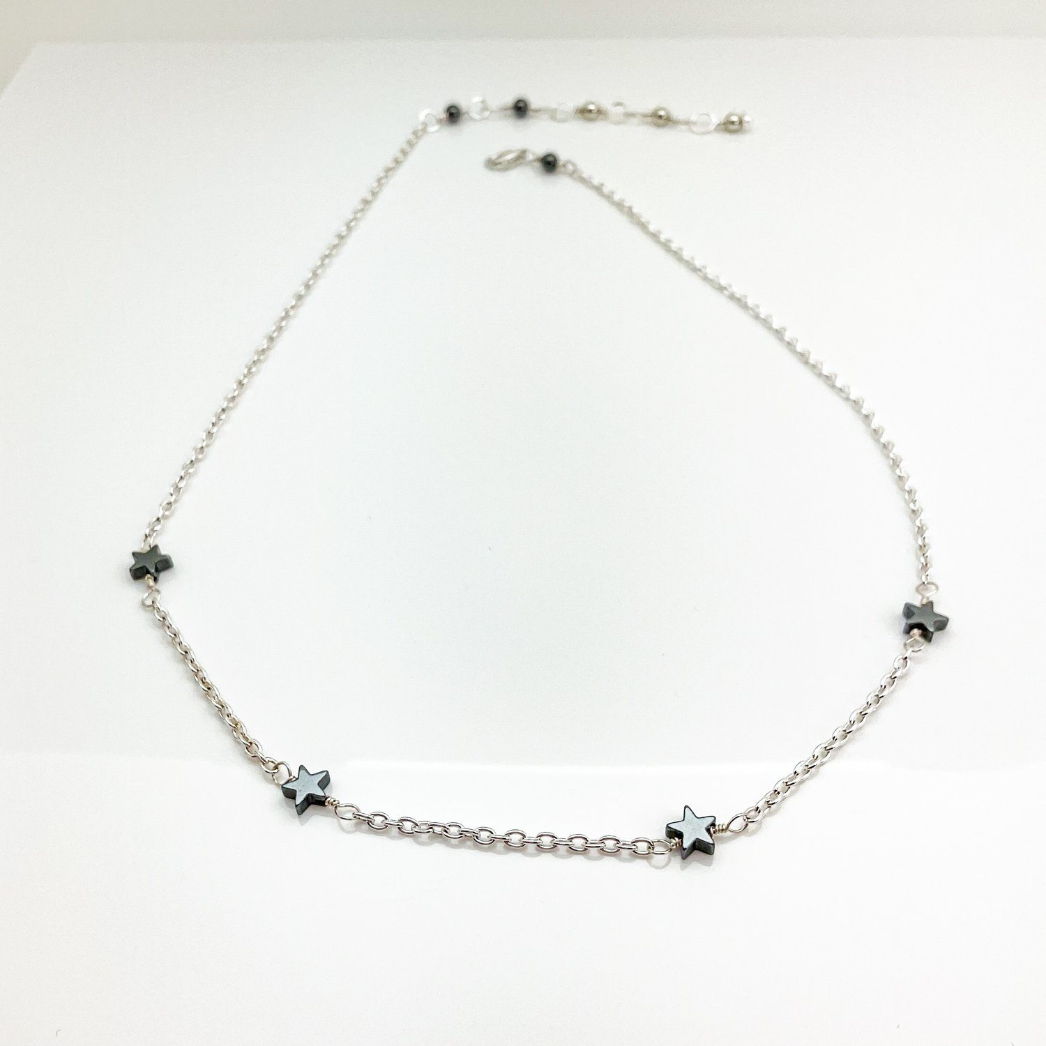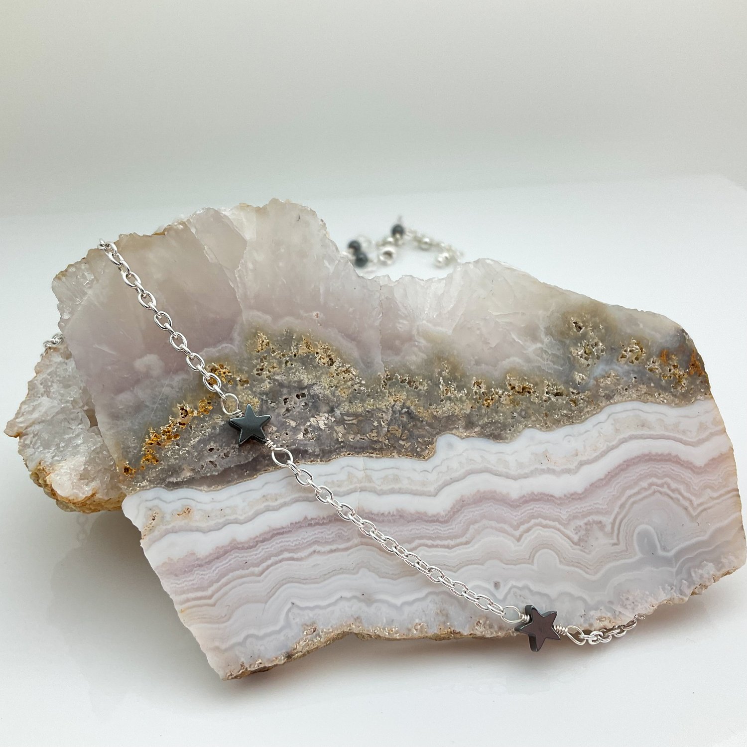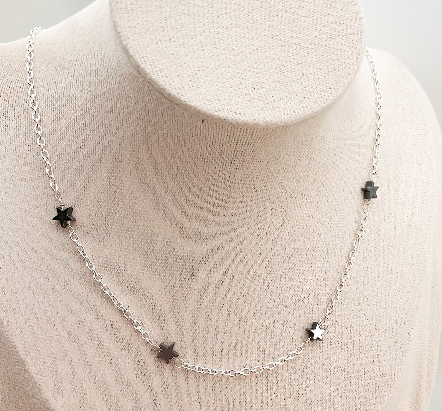 - Components: 4 star-shaped hematite beads, 3 round hematite beads, 3 silver-plated beads, silver-plated chain, sterling-plated lobster clasp