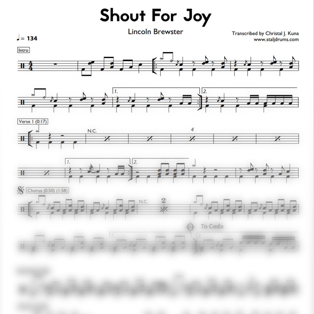 Drum sheet music for Shout For Joy by Lincoln Brewster, formatted by section and with timestamps.