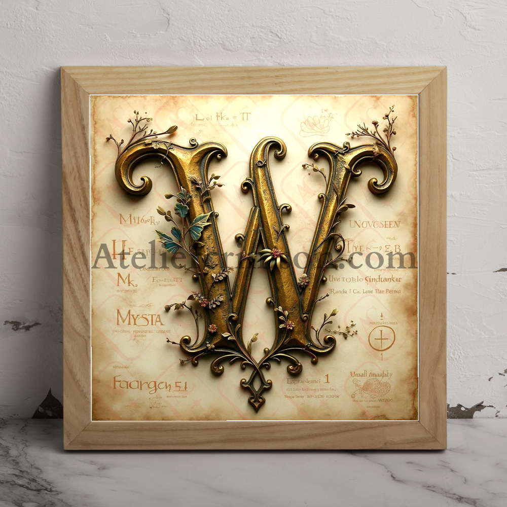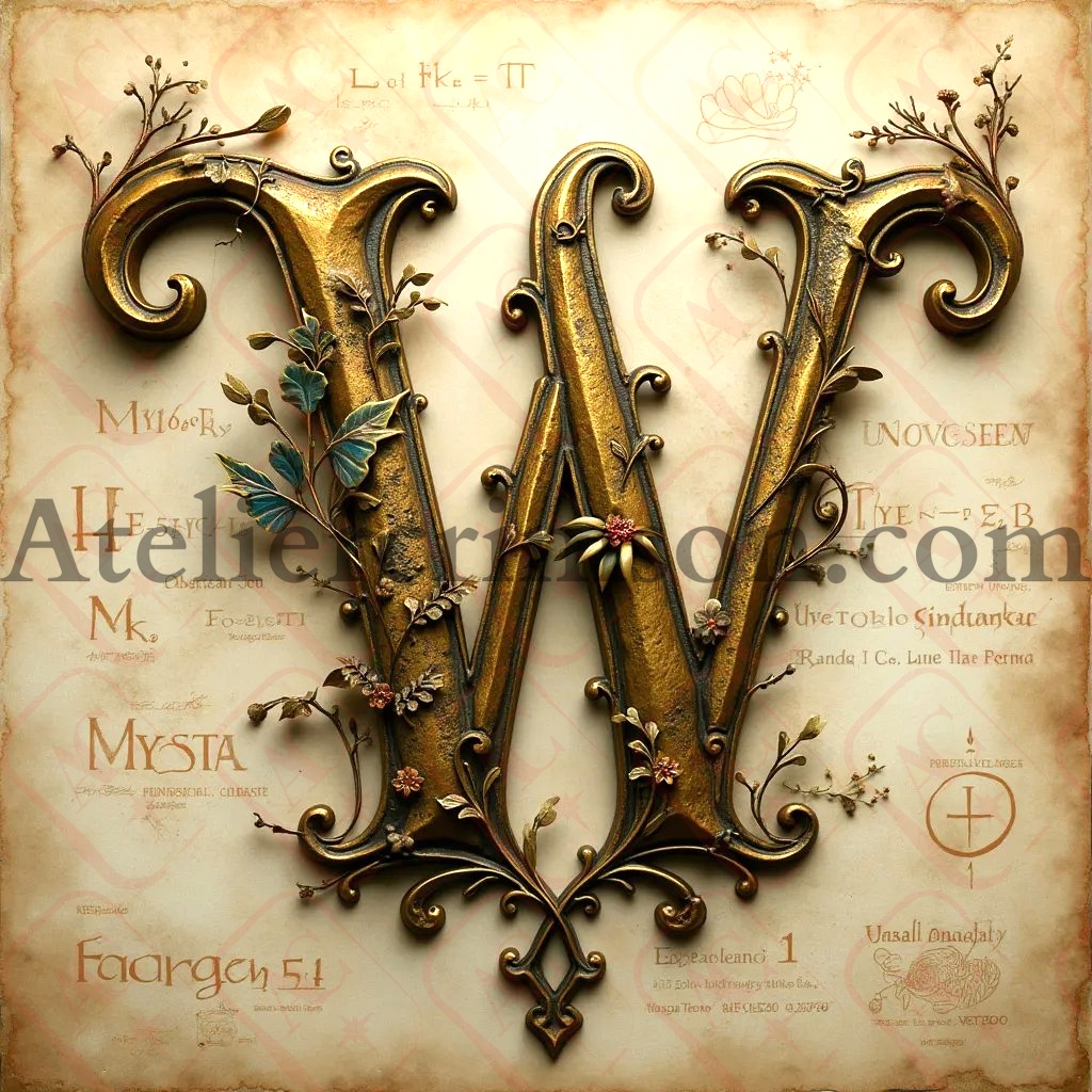 The letter W Art Nouveau alchemical Each character crafted as a stunning 3D brass sculpture with weathered patina, set against a mystical alchemical parchment. Ornate vines, floating bubbles, and antique gears create a magical shabby chic atmosphere. Perfect for vintage-inspired designs, book covers, or unique wall art."