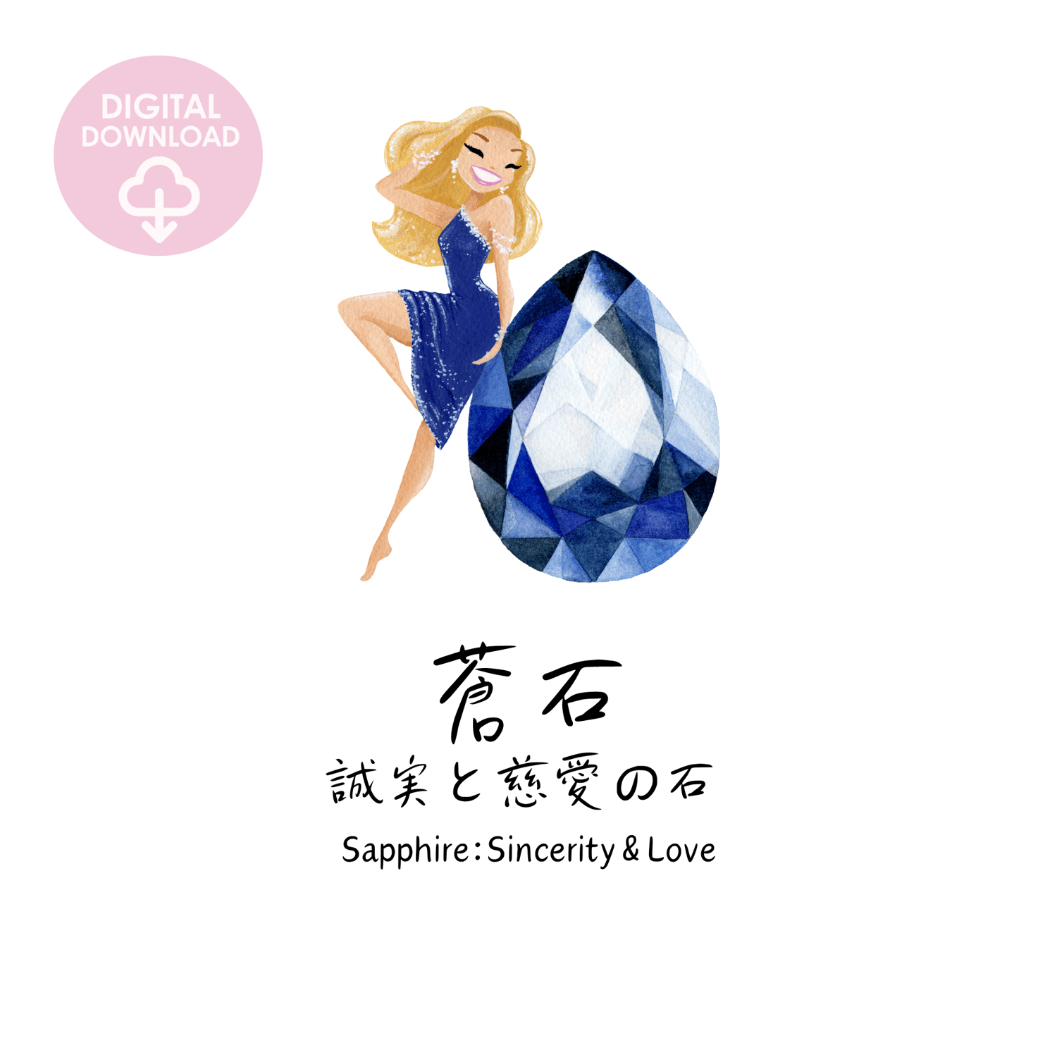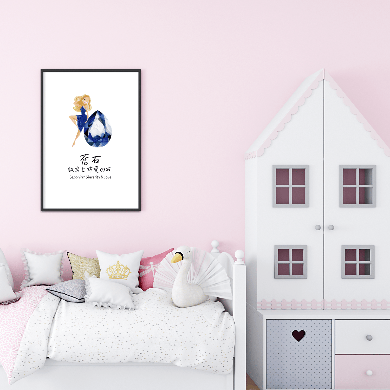 Adorn your walls with this exquisite sapphire-themed wall art, celebrating the birthstone of September. The artwork features a chic illustration of a woman, complemented by the rich, deep blue hues of the sapphire. The meaning of sapphire is elegantly displayed in both English and Japanese, adding a unique cultural touch. Printed on premium matte paper, this piece is perfect for any decor.