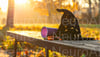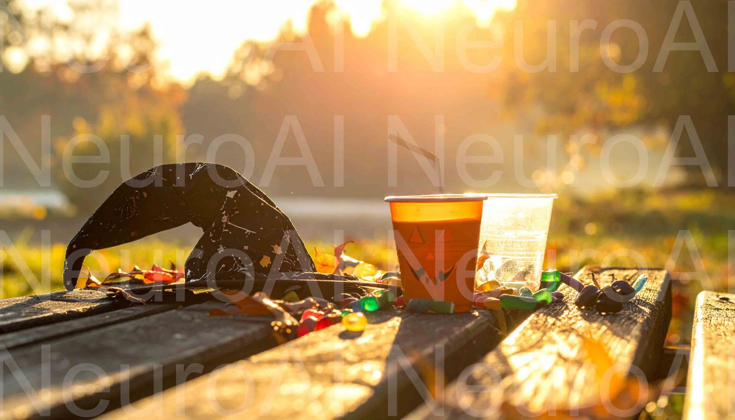 Enjoying Halloween treats at a picnic with a witch hat at sunset