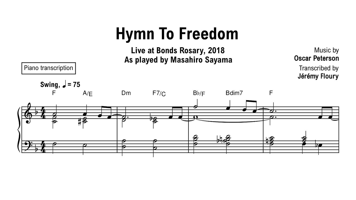 Transcription of Hymn To Freedom, as played by Masahiro Sayama.