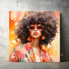 Watercolor 1970's Bohemian Woman with Afro and Sunglasses, Orange Abstract Bohemian Hippie Digital Print with Abstract Background, Instant Download