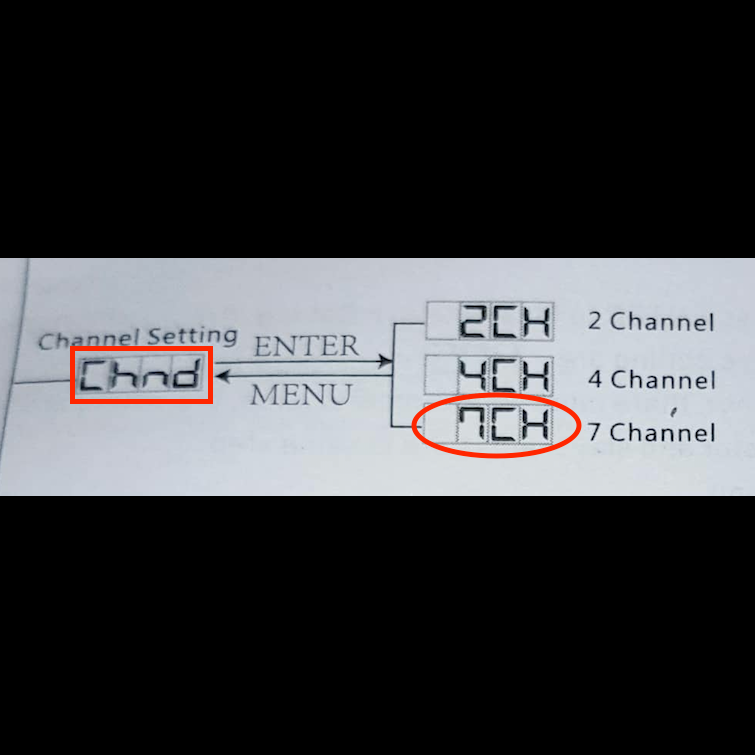 * Verifique, desde el display del equipo, que el menu "CHnd" muestre los modos "2CH", "4CH" y "7CH"