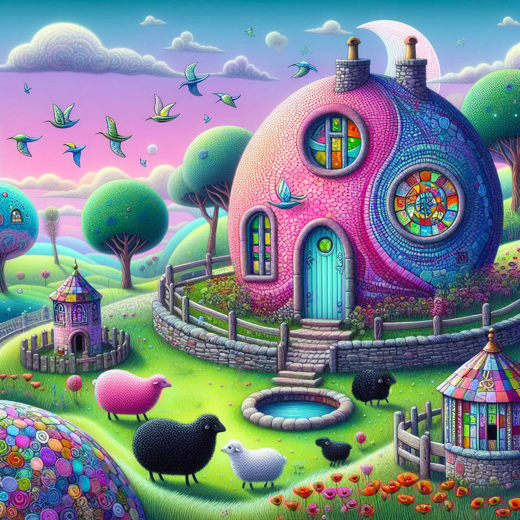 Quirky small half moon houses made of bright colourful tiny pink & blue bricks with mosaic glass tile roofs. A field with black curly sheep by a stone wall. Chickens & a fancy coup. There are poppies everywhere. A wishing well, pond & twisty trees, with glass bird houses & there are humming birds.