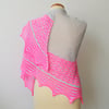 Finished dimensions of the sample shawl: 165.5 cm (65 inches) along the upper edge and a depth of 73.5 cm (29 inches), measured after blocking.