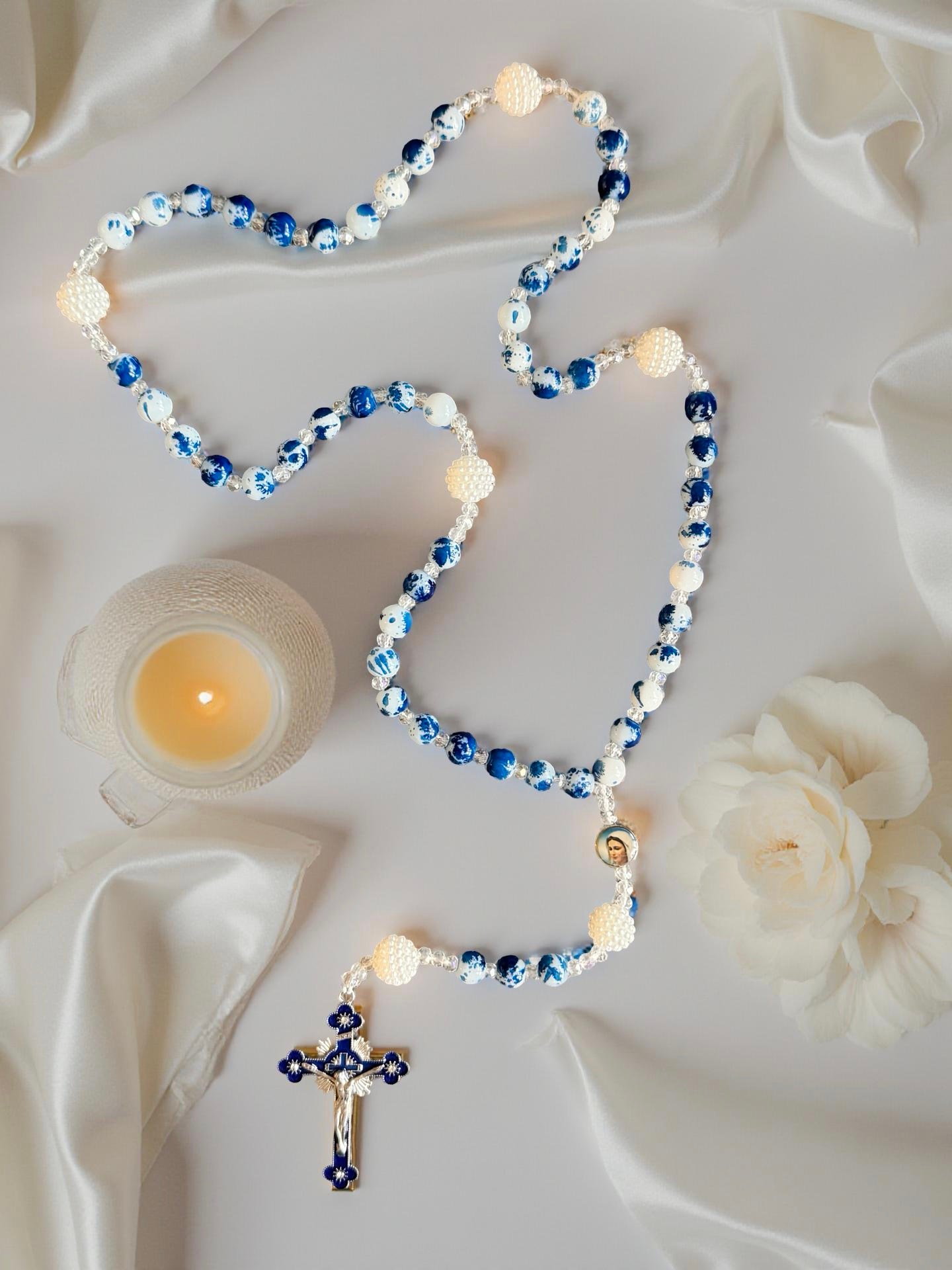 Experience the serene beauty of this handmade rosary featuring stunning blue and white glass beads reminiscent of classic paint. Elegance of traditional blue and white ceramic artistry, creating a devotional piece that's both spiritually meaningful and visually captivating.