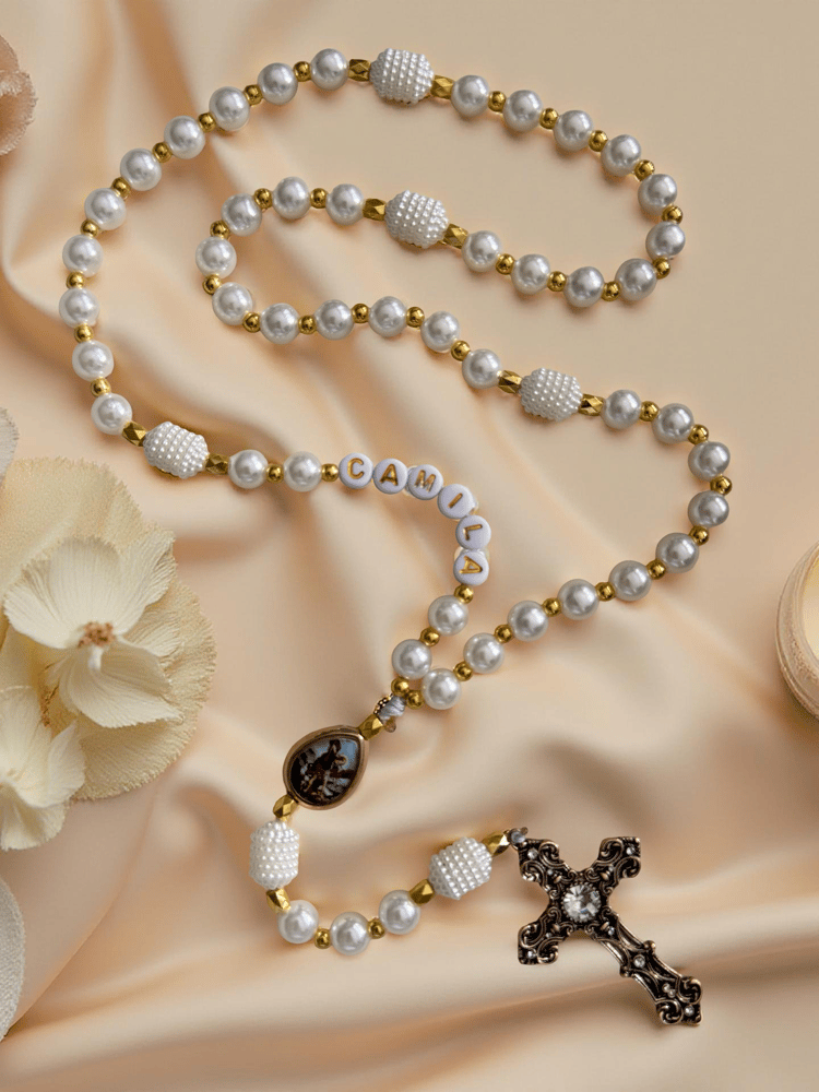 The harmonious combination of hand-painted blue and white glass beads with natural variations, creamy white crystal separator and Our Father beads that sparkle with divine light, an elegant dual face medallion Our Lady of Fatima and Archangel Michael and a Blue Matching Crucifix.