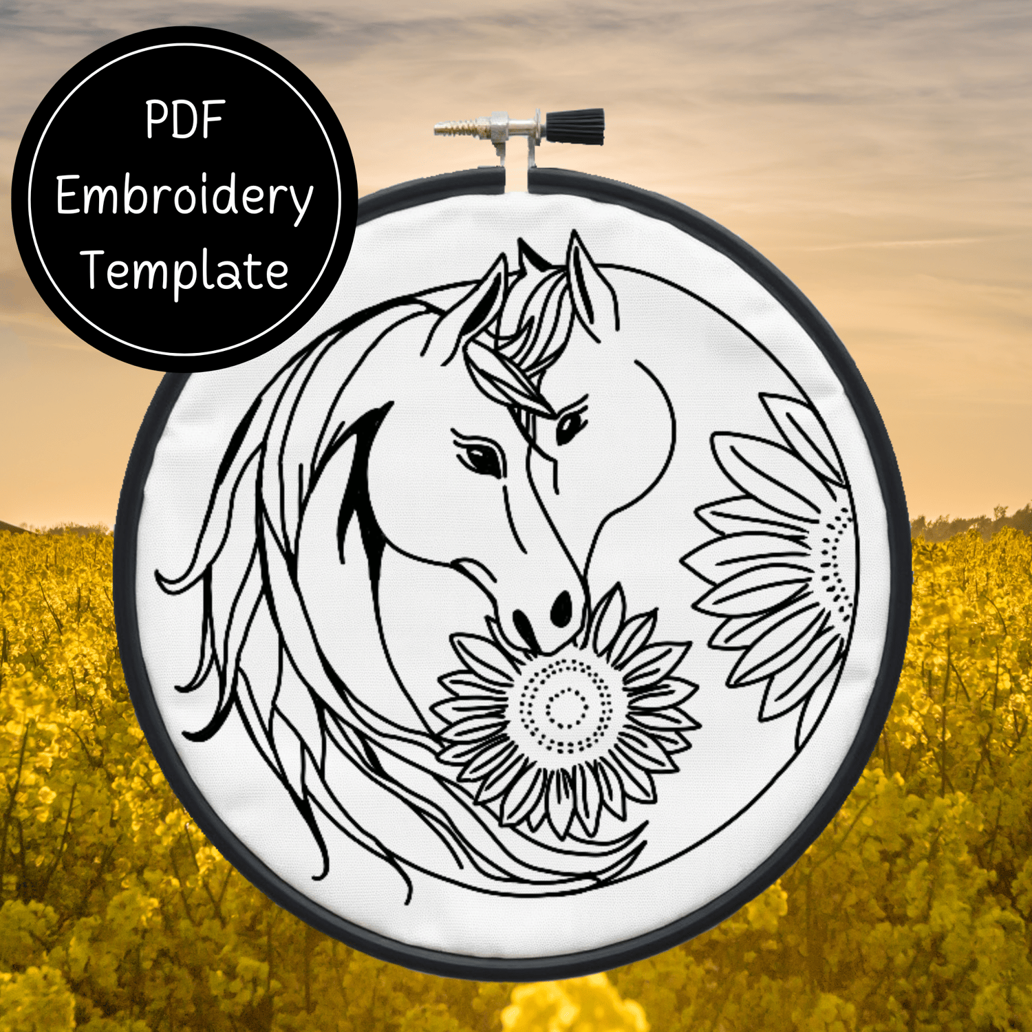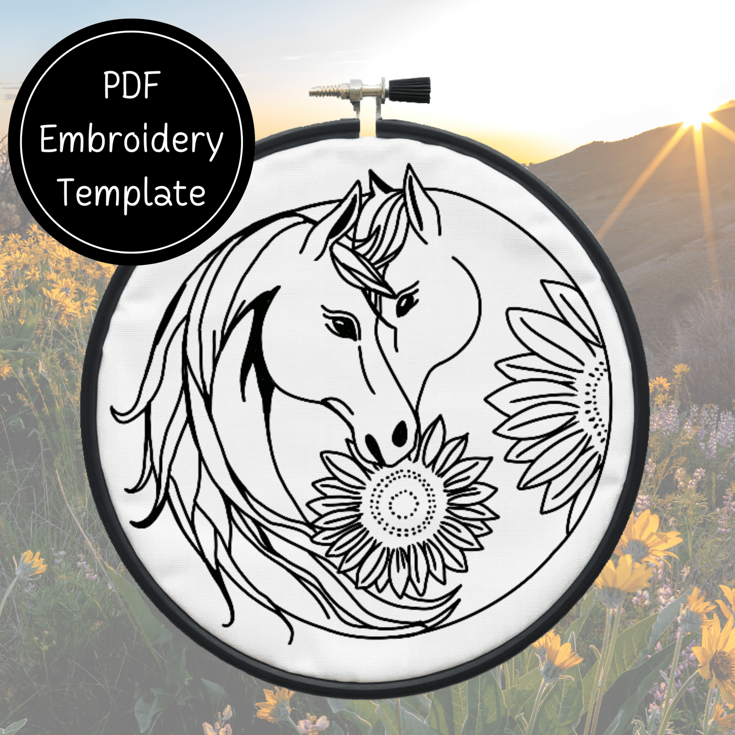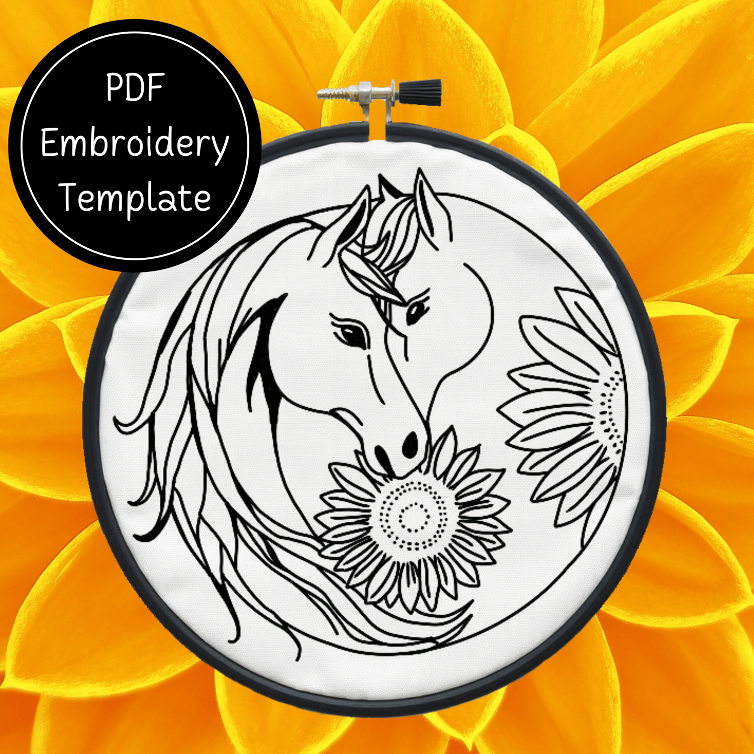 Yin Yang Horse Sunflowers Embroidery Template PDF - DIY Horse Design For Hand Stitching - Instant Download
