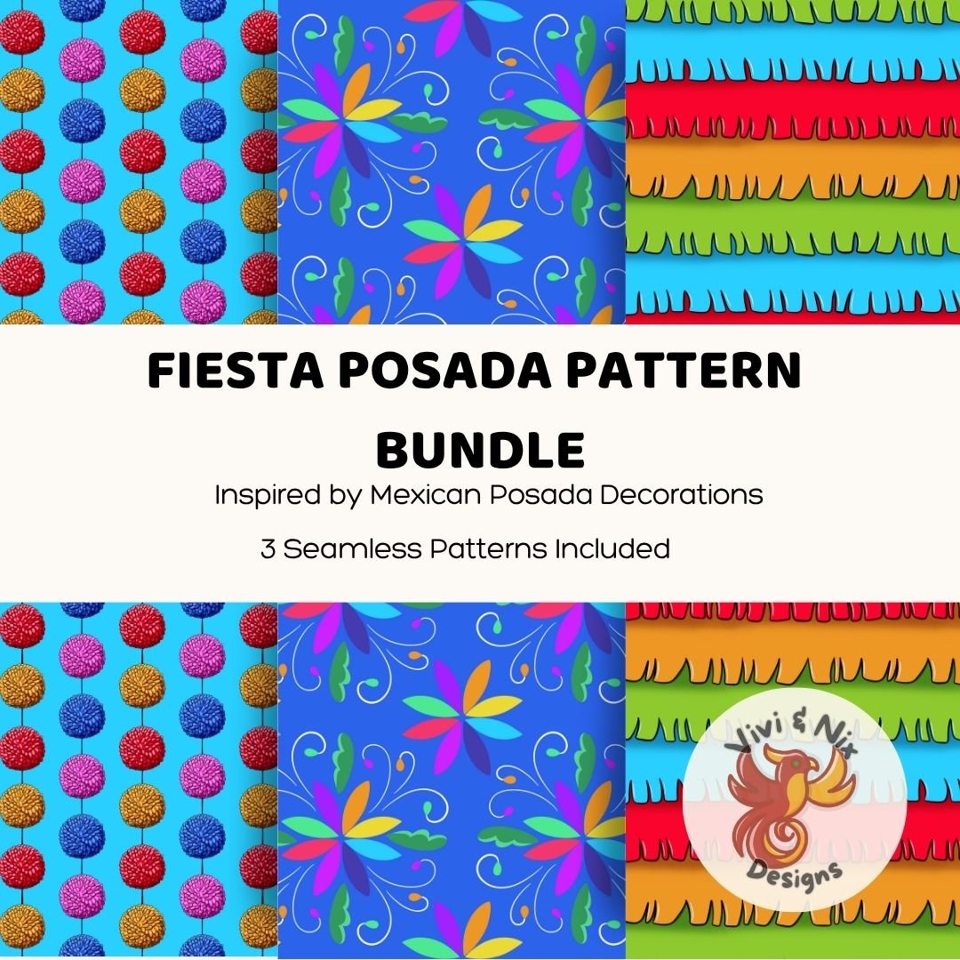 Inspired by the bright decorations and traditional Mexican Posada celebrations, this set of seamless patterns features bold colors, festive details, and a cheerful handmade feel — perfect for any celebration or small business project.