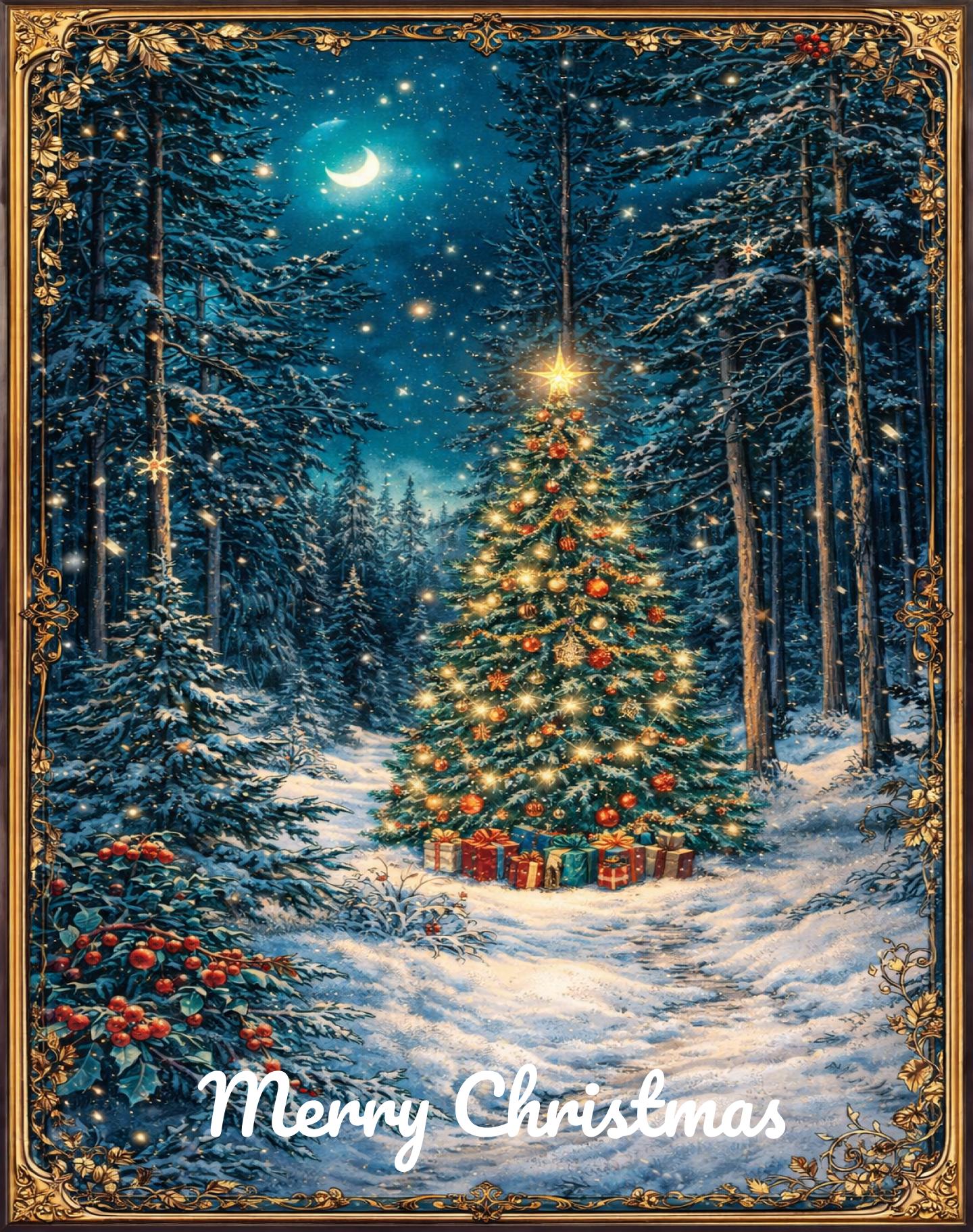 This Christmas card delivers a sense of classic elegance and magical wonder, set within an ornate golden frame that instantly conveys a premium, festive feel. At the center, a beautifully decorated Christmas tree glows warmly in a quiet, snow-covered forest, illuminated by twinkling lights and crowned with a radiant star. Beneath the tree, neatly wrapped gifts add a joyful promise of celebration and giving.
