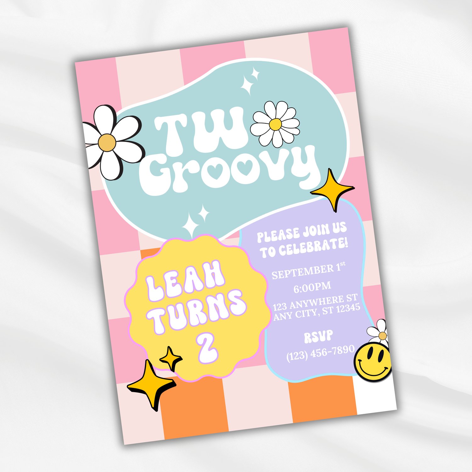 Get groovy and celebrate in style with this retro "Two Groovy" birthday invitation template! Featuring fun daisies, pastel colors, and a playful 70s-inspired design, this invitation is perfect for your little one’s 2nd birthday celebration.