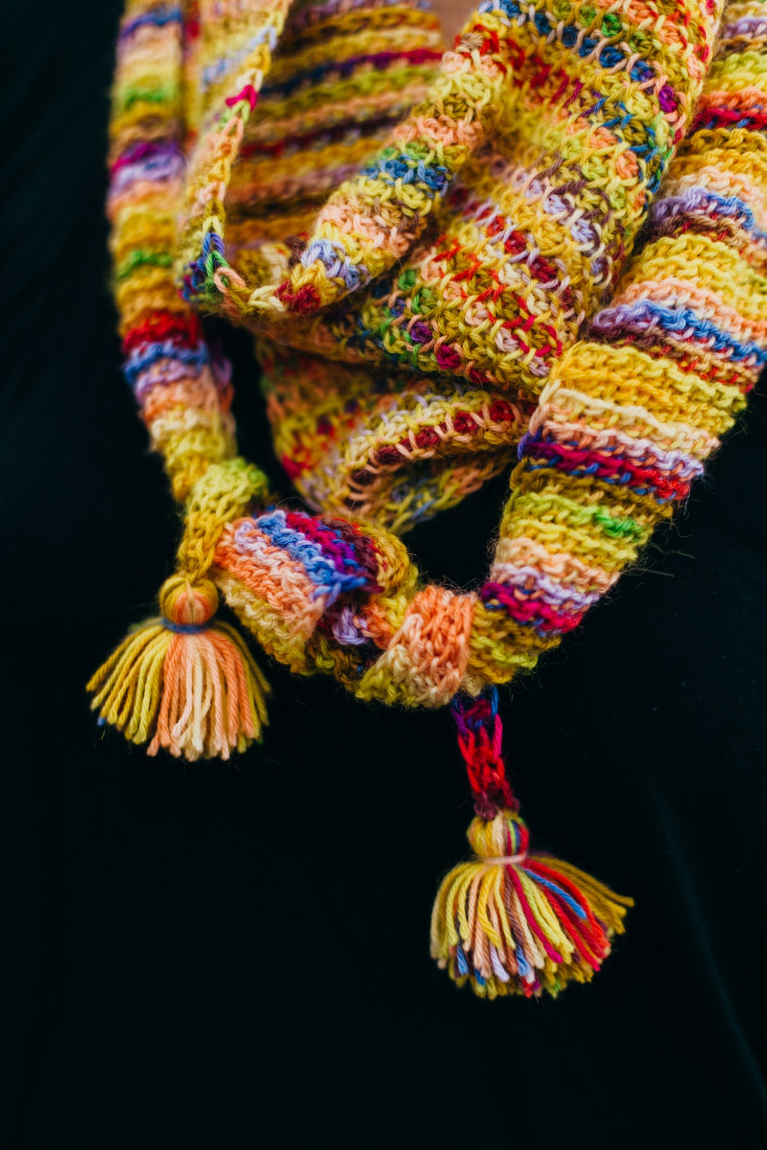 The sample uses about 68g / 238m each of two colours of 4 ply (fingering) yarn. Choose colours that have a good contrast and are of similar fibre.