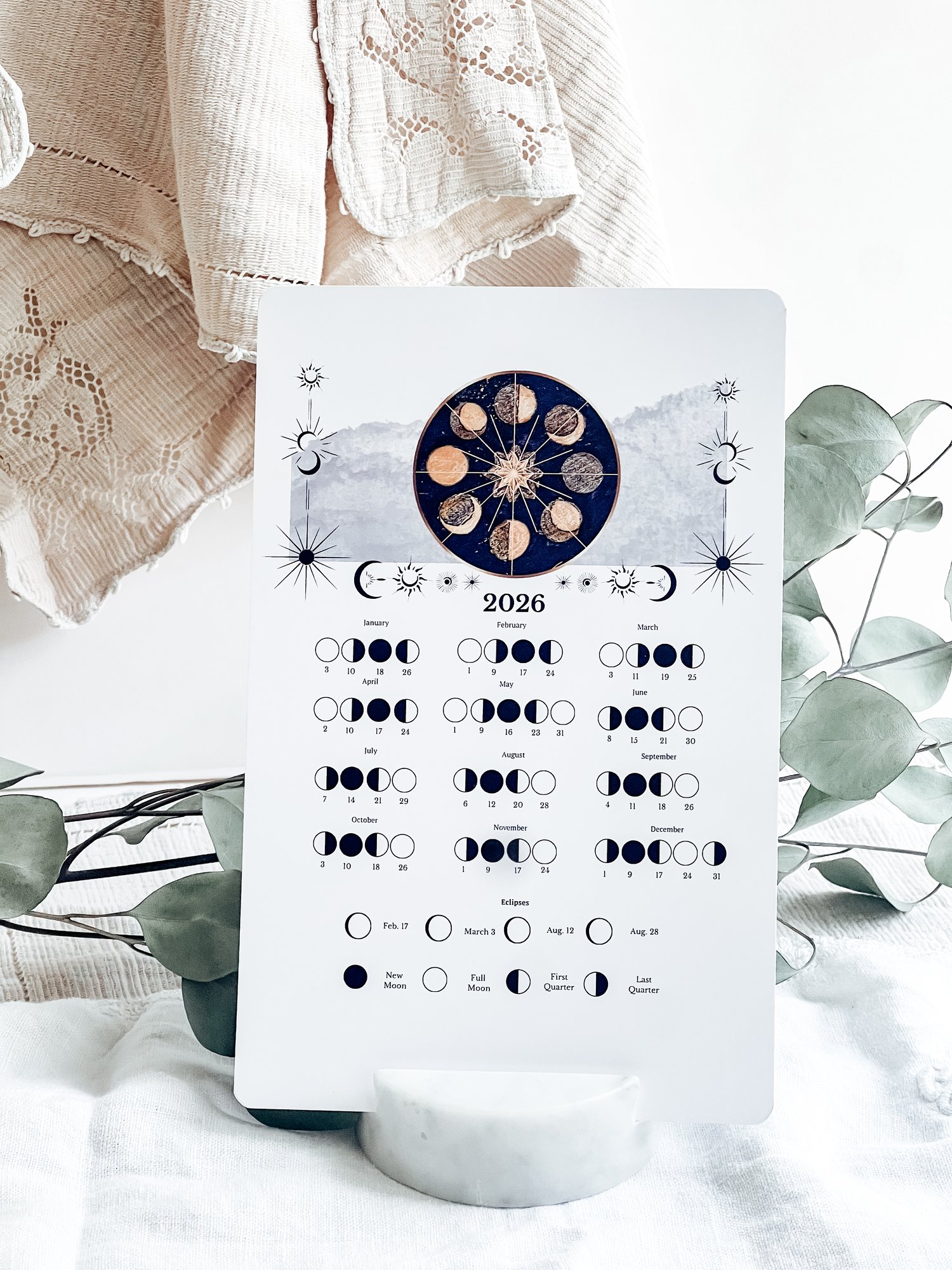 Stay connected to the rhythms of the moon all year long with this beautifully designed 2026 Moon Phase Calendar. Featuring a clean, light background, each month highlights the moon’s phases — new, first quarter, full, and last quarter — along with the eclipse dates for the year. Perfect for lunar tracking, journaling, garden planning, or adding a touch of celestial calm to your home or workspace.