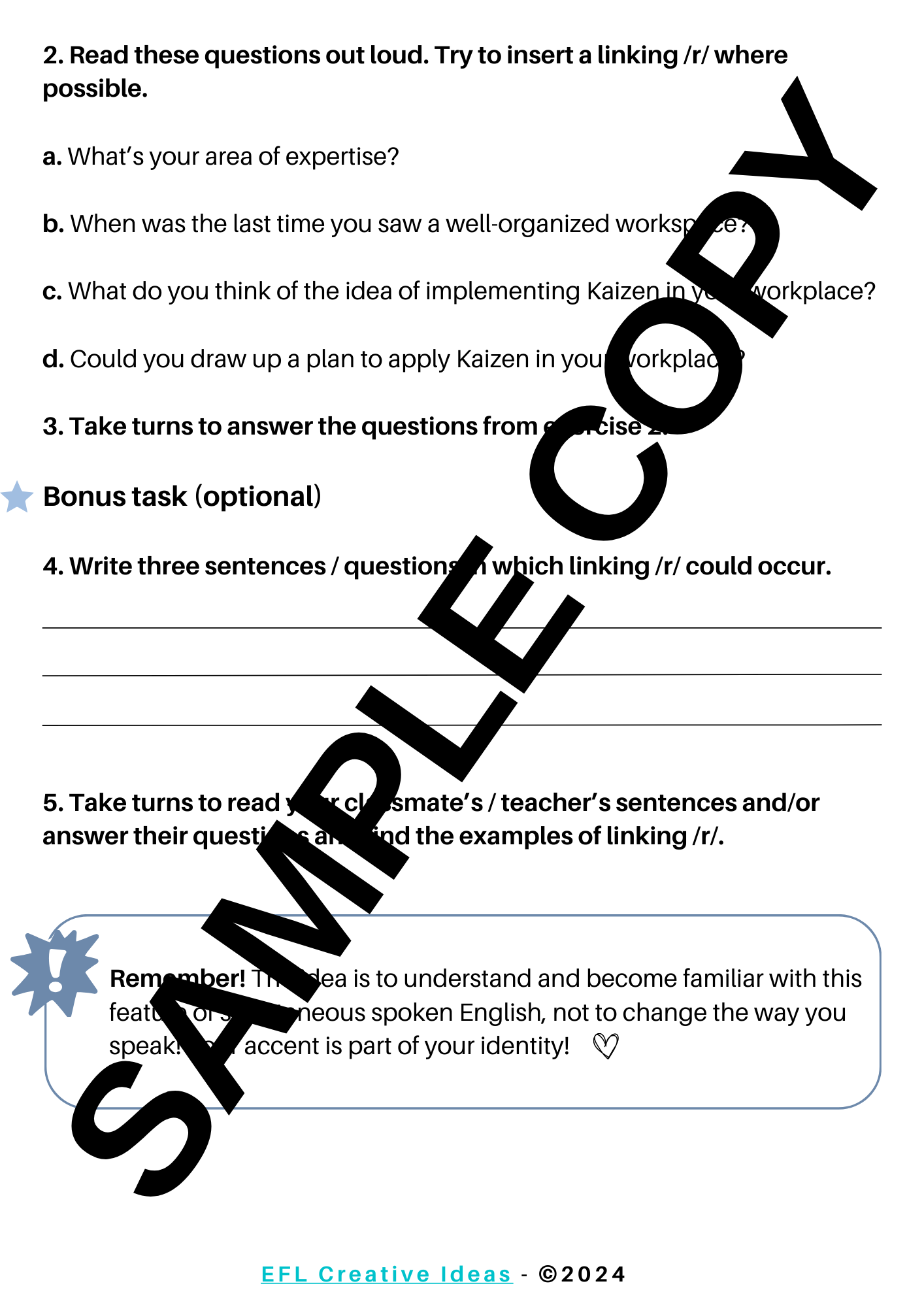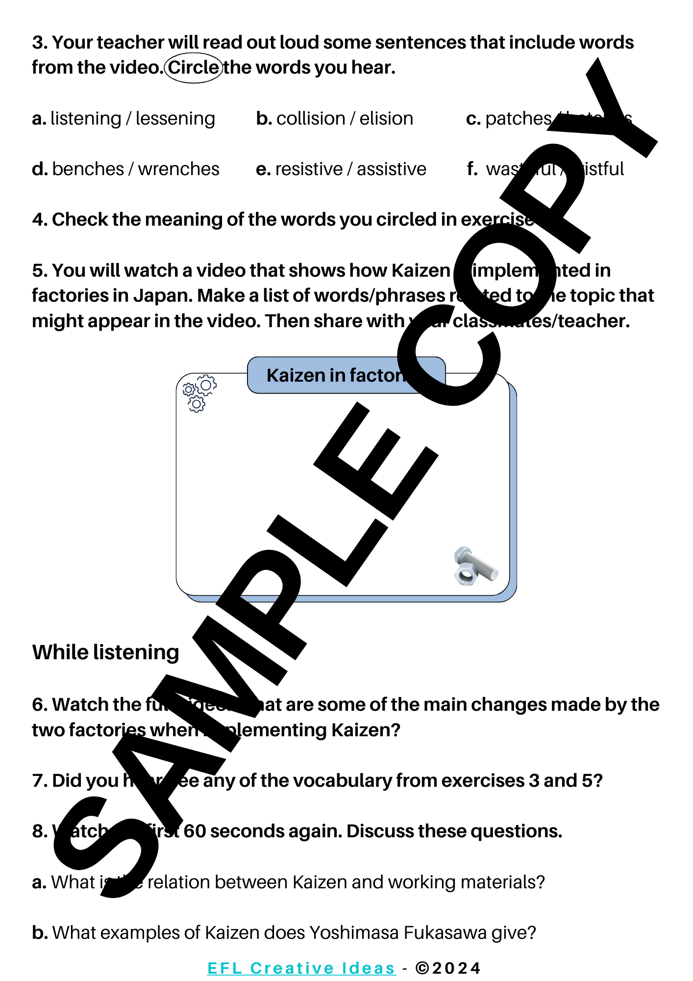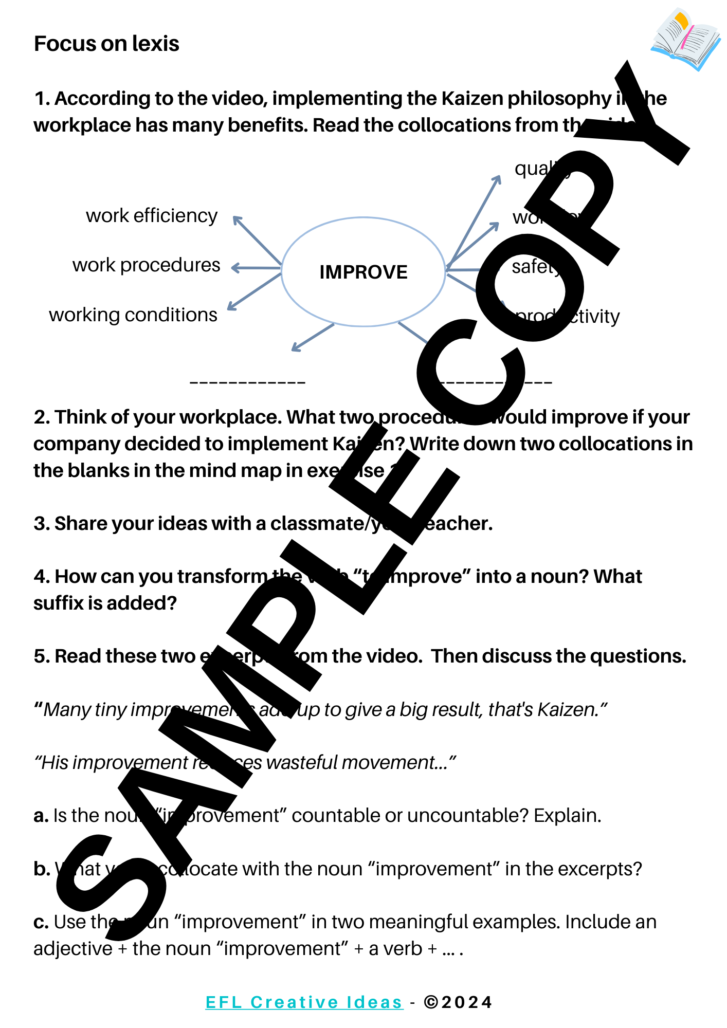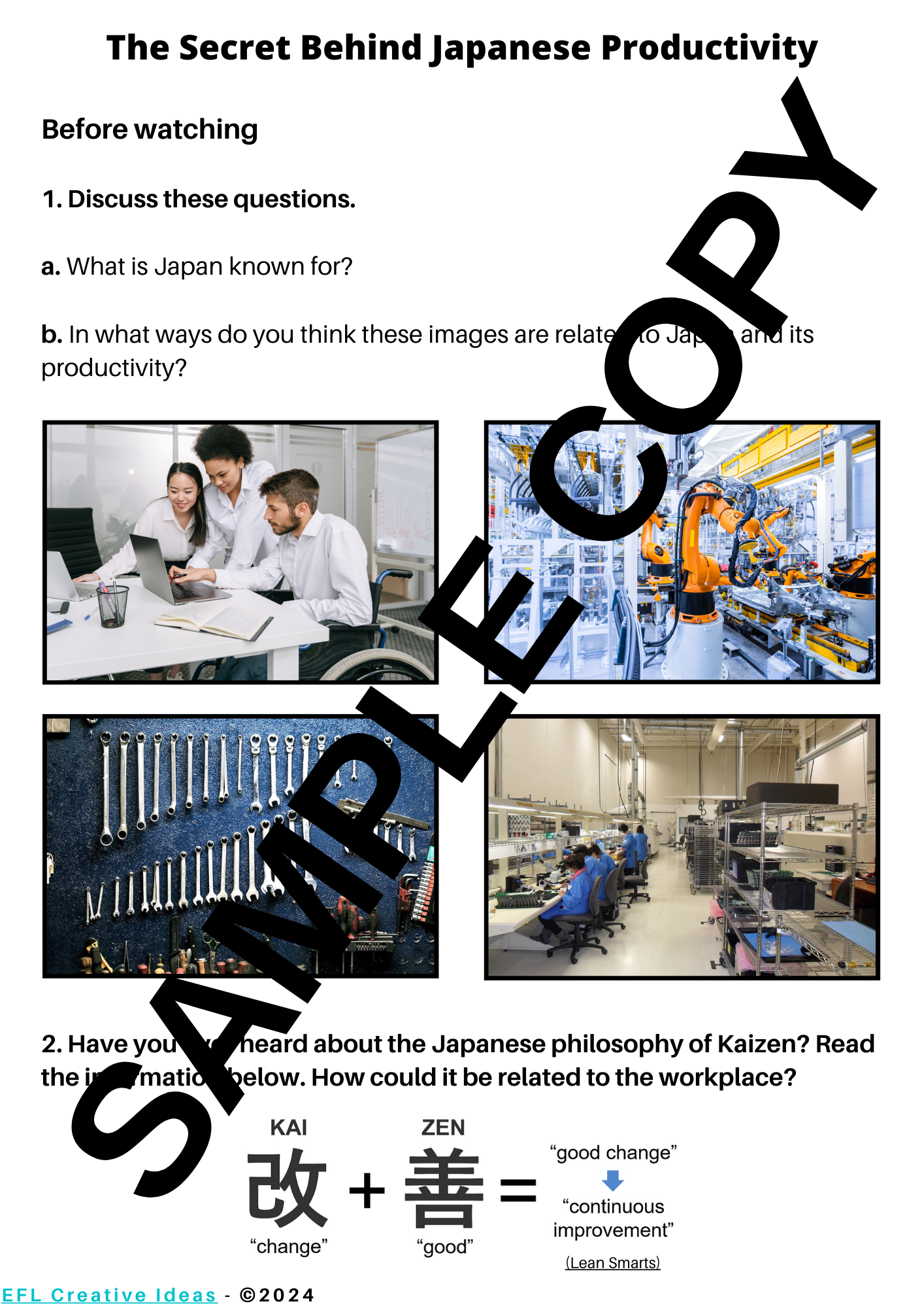 In this lesson, students will talk about Japan and some facts about it, the concept of productivity and the importance of Kaizen philosophy. Students will also listen for gist and for detail. They will work on connected speech (intrusive "r") and some lexis (collocations with the verb "to improve"). By the end of the lesson, students will try to implement Kaizen philosophy in their own business context.