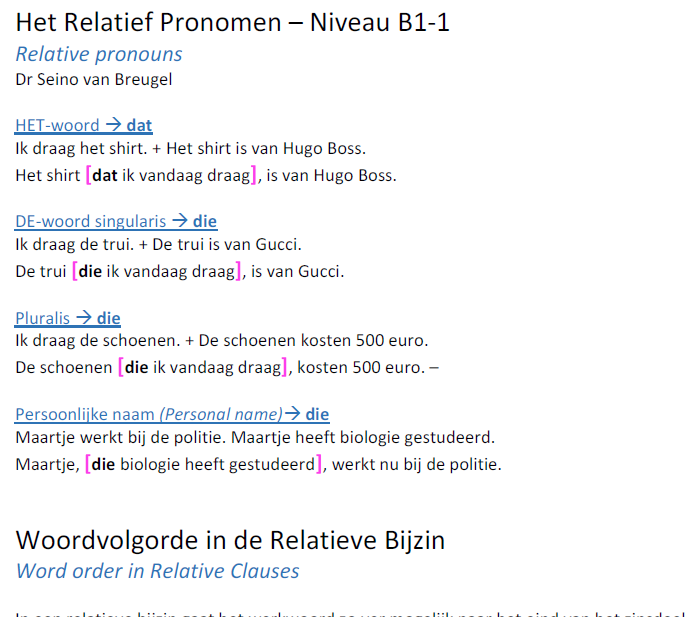 - a one-page grammar sheet explaining the use of relative pronouns in Dutch as well as the structure or word order of the relative clause (relatieve bijzin).