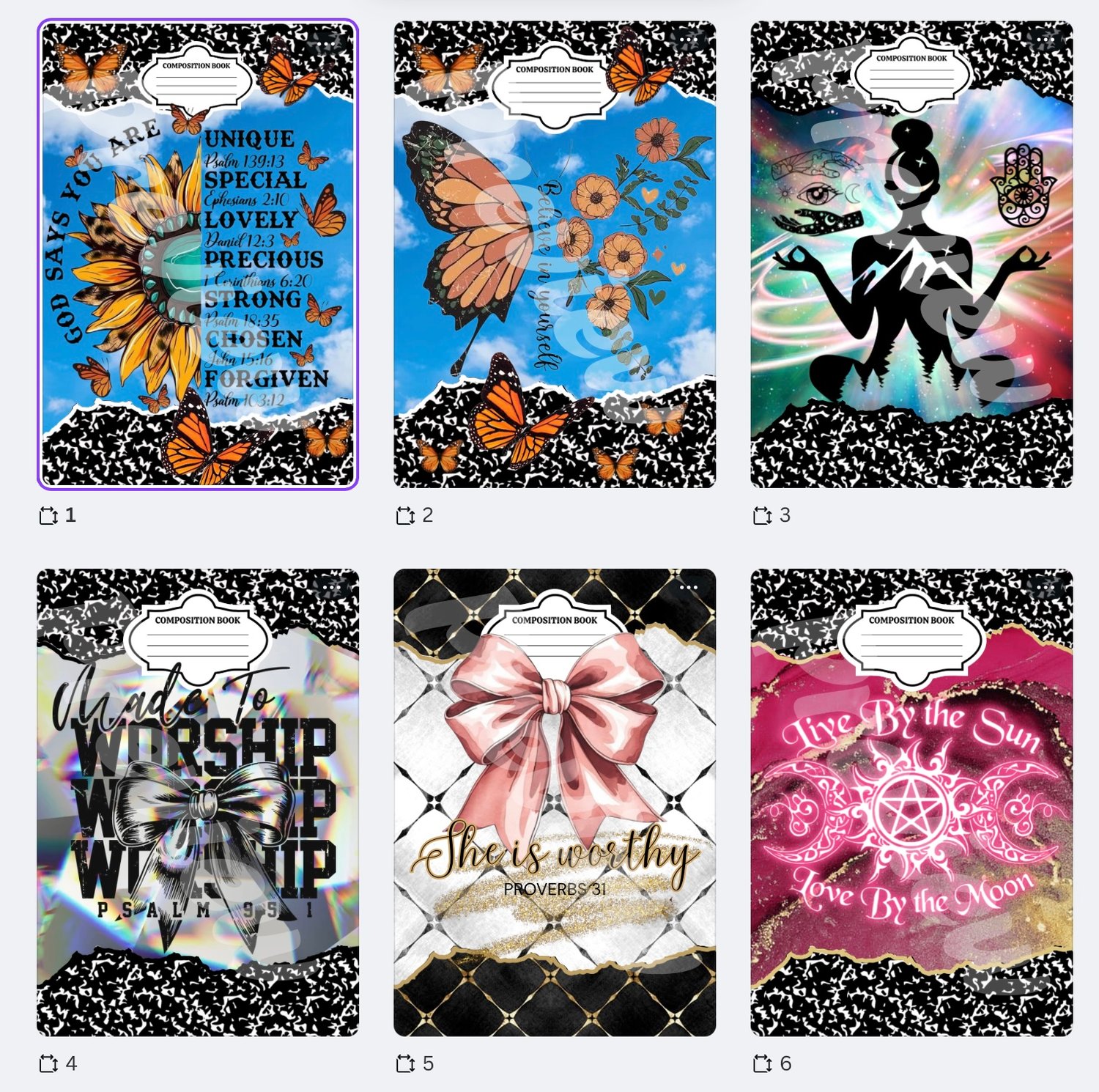 18 spiritually themed composition notebook templates. Edit, download, and print in Canva. Sized to 6.9x10