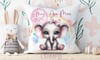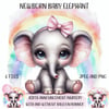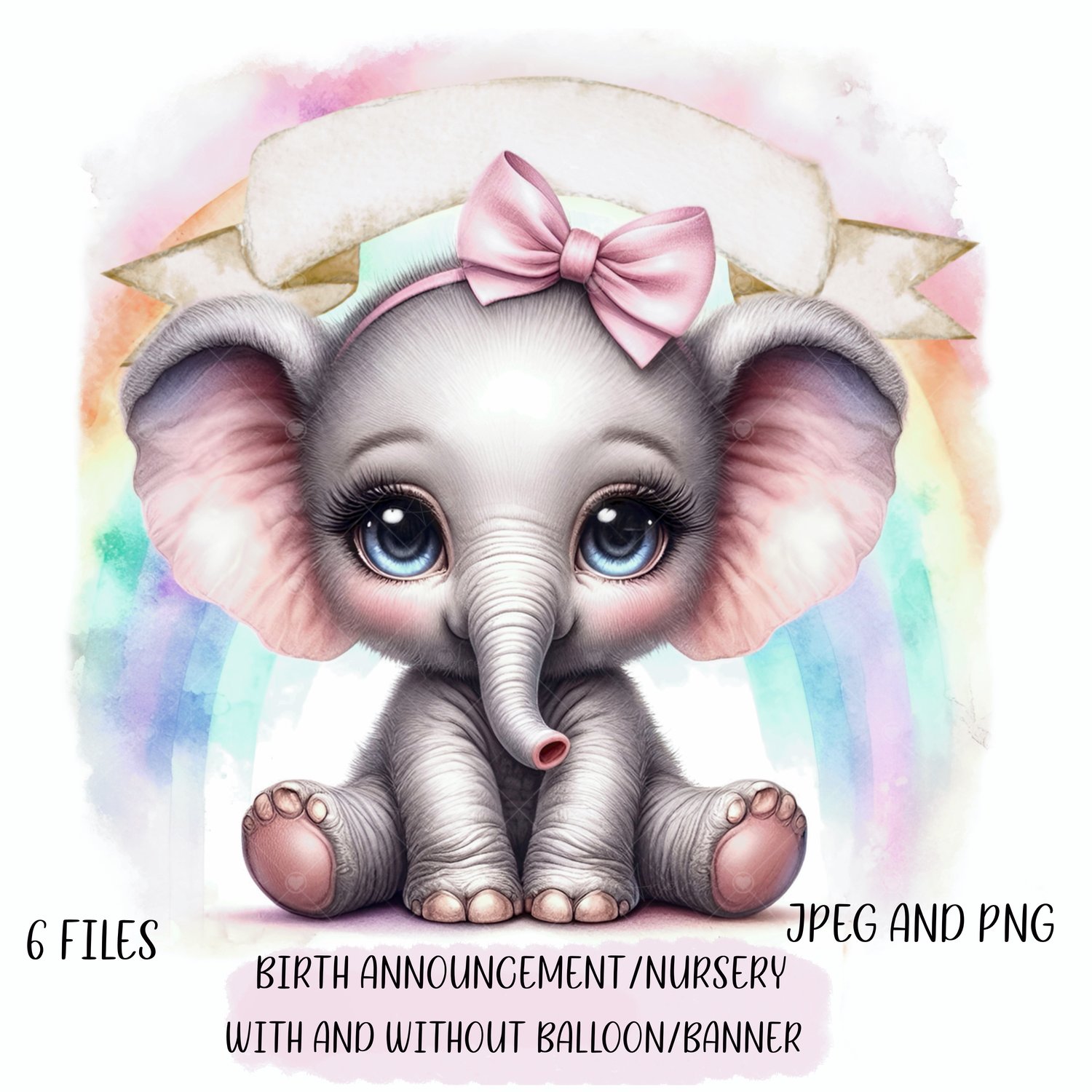- baby girl elephant with rainbow and banner, PNG and JPEG format.