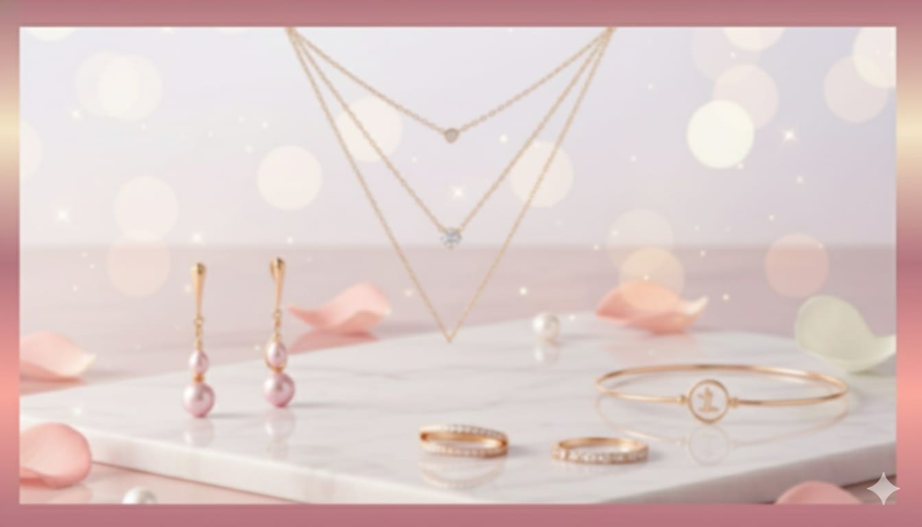 A sparkling jewellery banner featuring gold necklaces, earrings, and rings with soft bokeh lighting.
