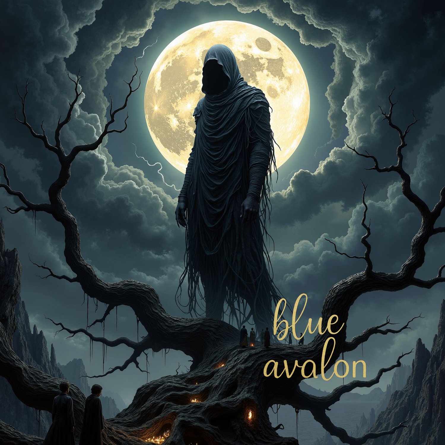 The Night Walker - A haunting figure shrouded in tattered robes stands silhouetted by a glowing, full moon. Faceless and hooded the silhouette looms in eerie stillness, as if watching or waiting in the shadows of the night. This atmospheric art work taps into gothic fantasy, folklore and the unknown. Both unsettling and beautiful, it speaks to mystery, darkness and quiet power.