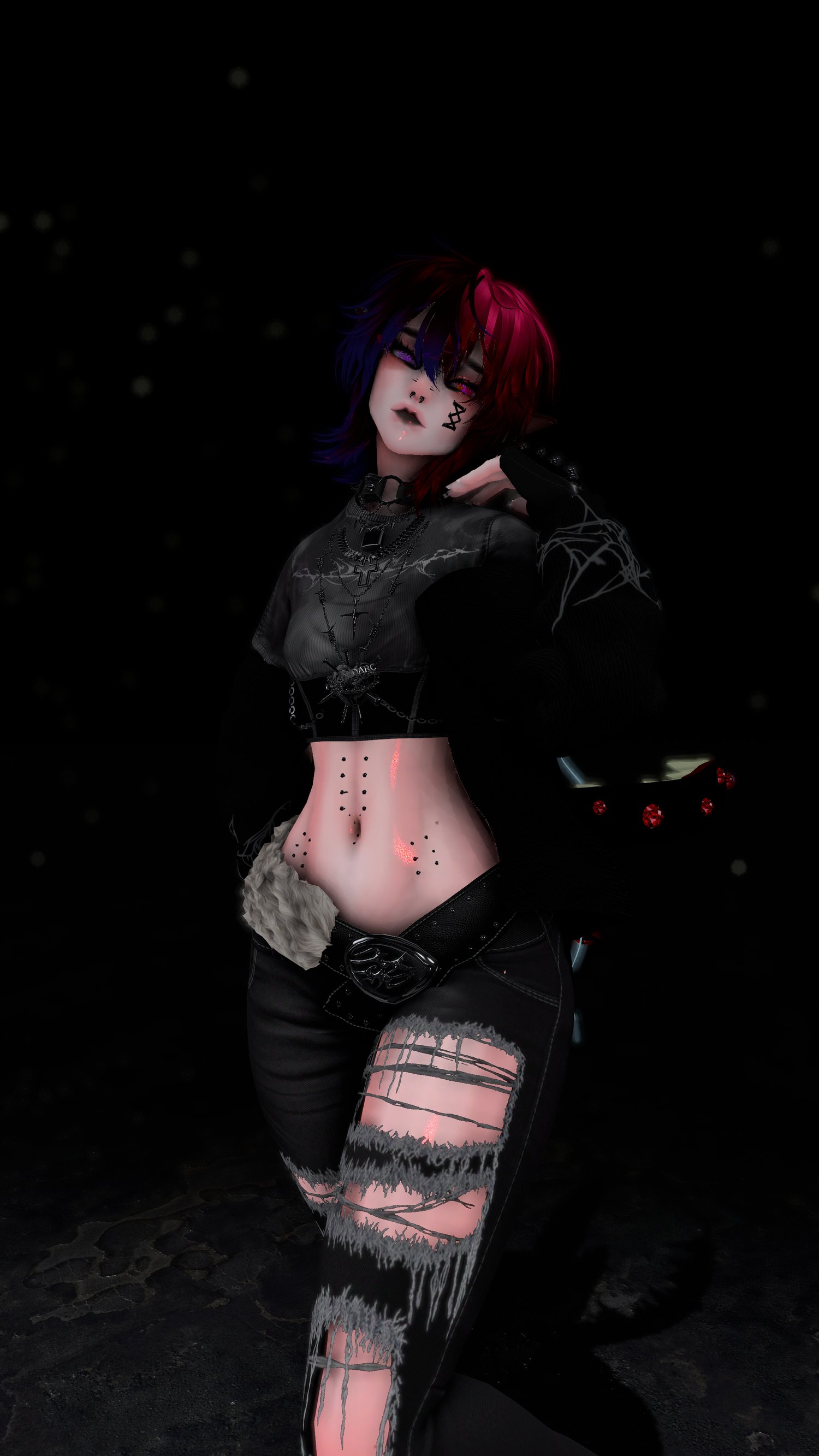 Accessories (Crypt-tease Harness by TheRealThiccWitch (No longer available.), MoonPhases FlowToy by CoffeeCat, FUR BELT by 𝙃𝙀𝘼𝙑𝙀𝙉, egirl warmers by kokori, Acc.05 by aaii0, Gothic Gloves by Lona, Pancakes Glasses by Pancake, 020 - zm piercings by Devilishsly, and ;;018 [Piercings] by aaii0.)